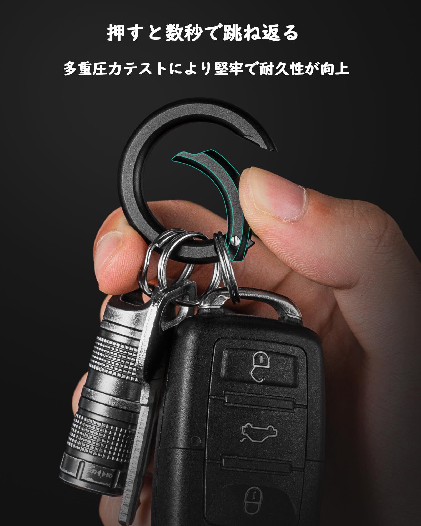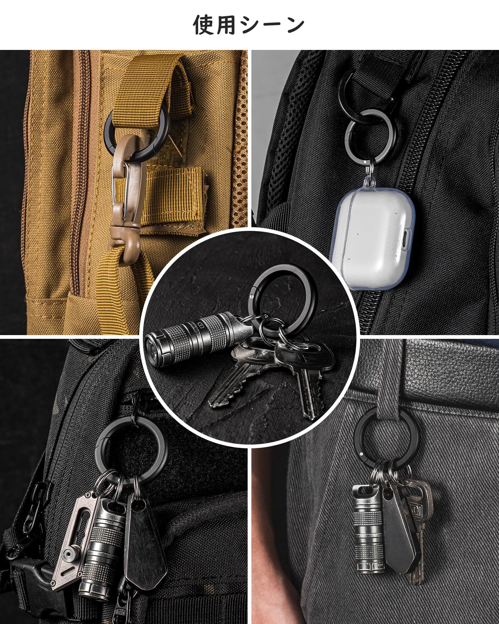 [いろいろな使用シーン]高級感のあるチタン素材と機能性を兼ね揃えた丸型カラビナで、車のスマートキーや家の鍵などの紛失防止のキーホルダーとして使用したり、バックや財布にキーホルダーなどの装飾品をつける際のリングや金具としてや、サングラスなどの小物を引っ掛けるフックとしても便利です。また小型犬や猫のベルトフックや、買い物で荷物が多くなってしまった時にまとめたりもできます。