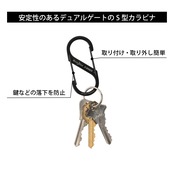 S字型のステンレス・アクセサリーカラビナ。2箇所のフックで、取り付け&取り外しを別々に行うことができるとても便利なアイテムです。