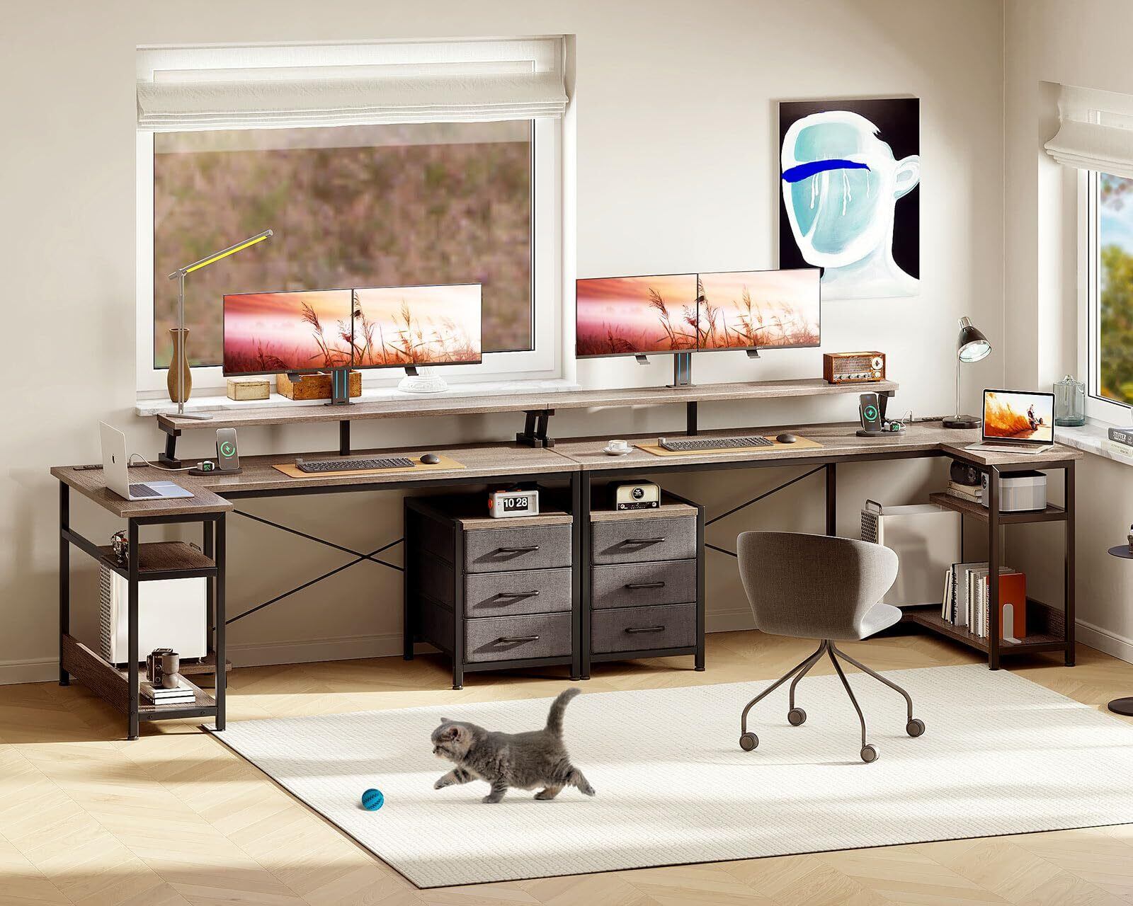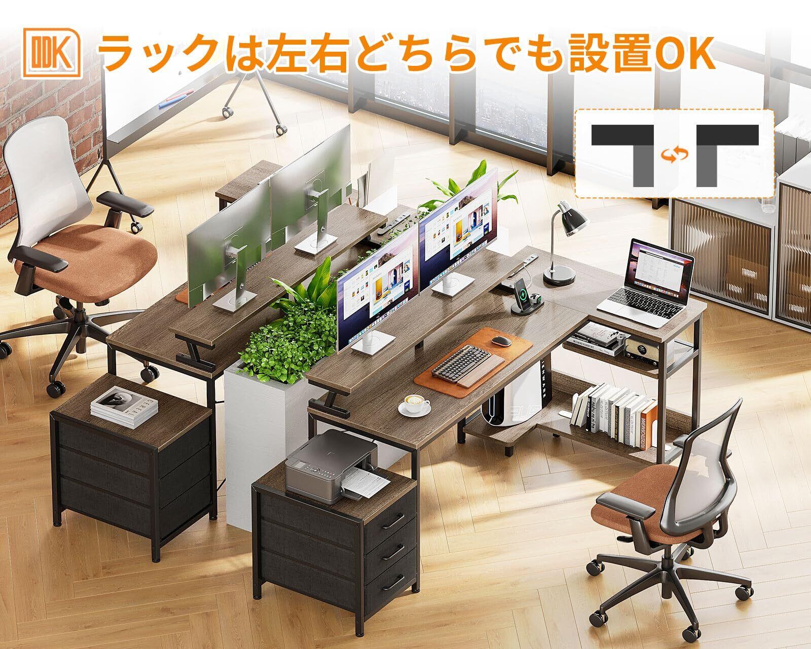 【引き出し付きデスク・収納力満載】デスクの足元には一体型の引き出しとラックが備え、本や書類などを使いたい時にサッと取り出せます。たっぷりの収納でデスク周りをスッキリ快適に!また、L字型のデザインで部屋のコーナーを最大限に活用でき、ご家庭でもオフィスでも、日常の仕事に十分なスペースを確保できます。