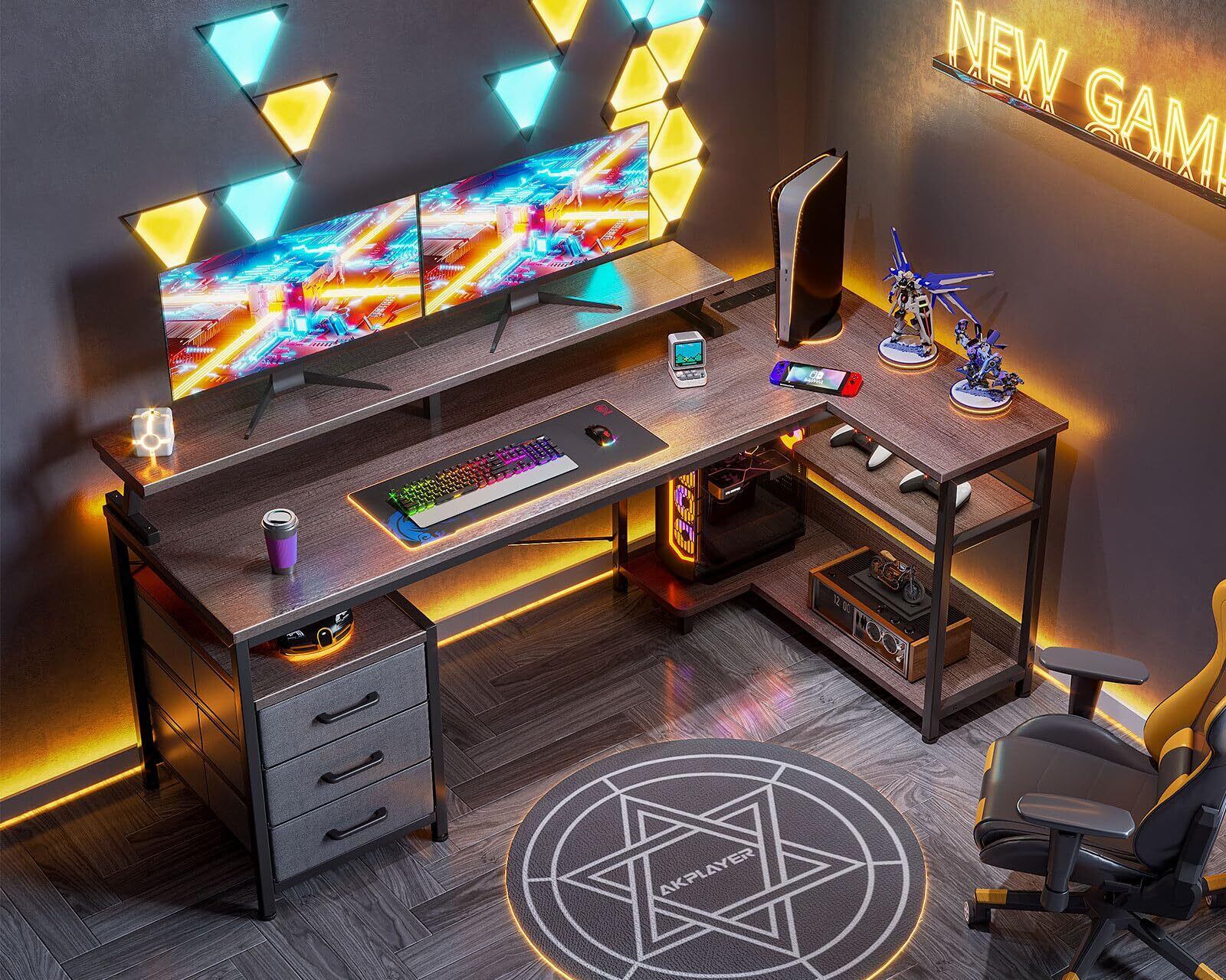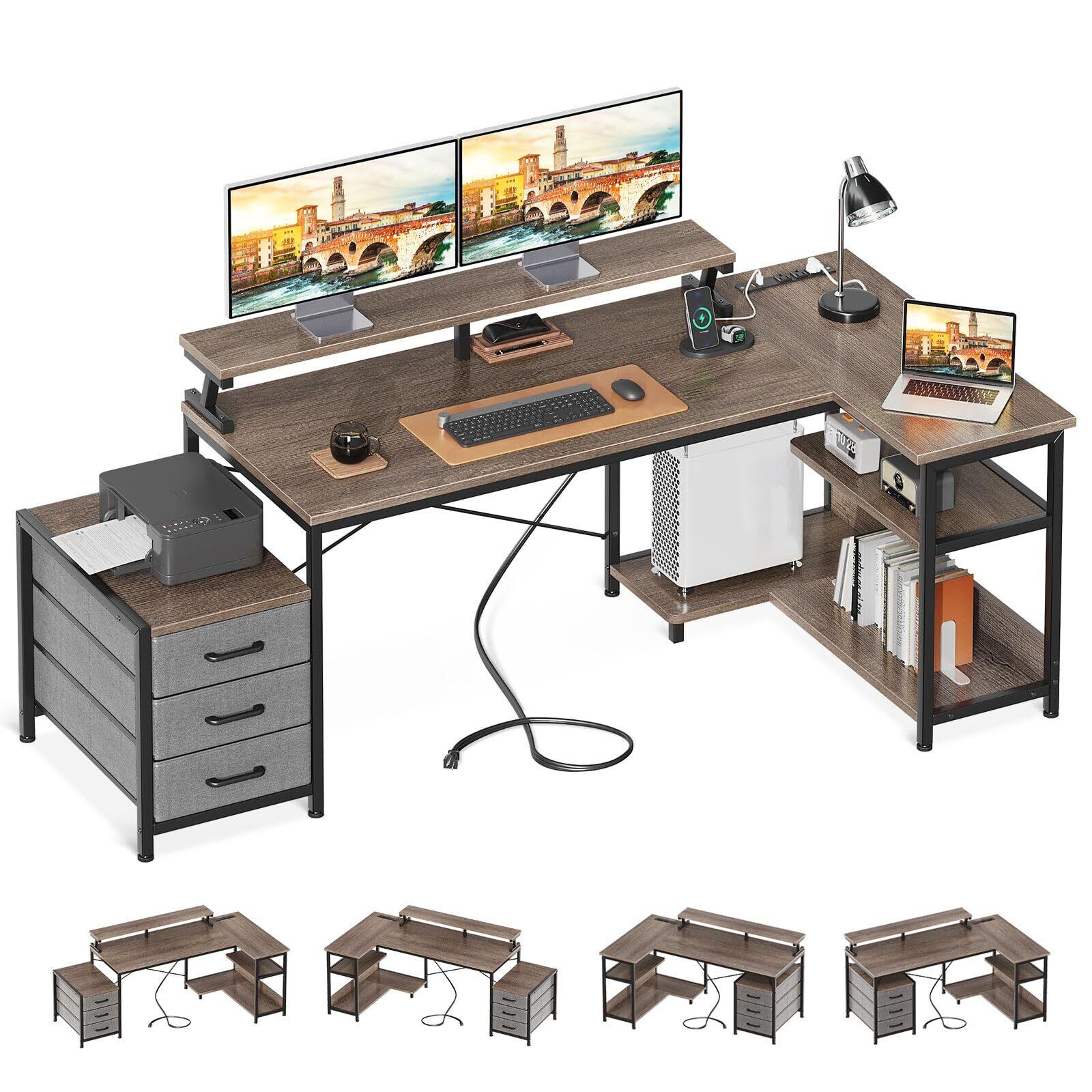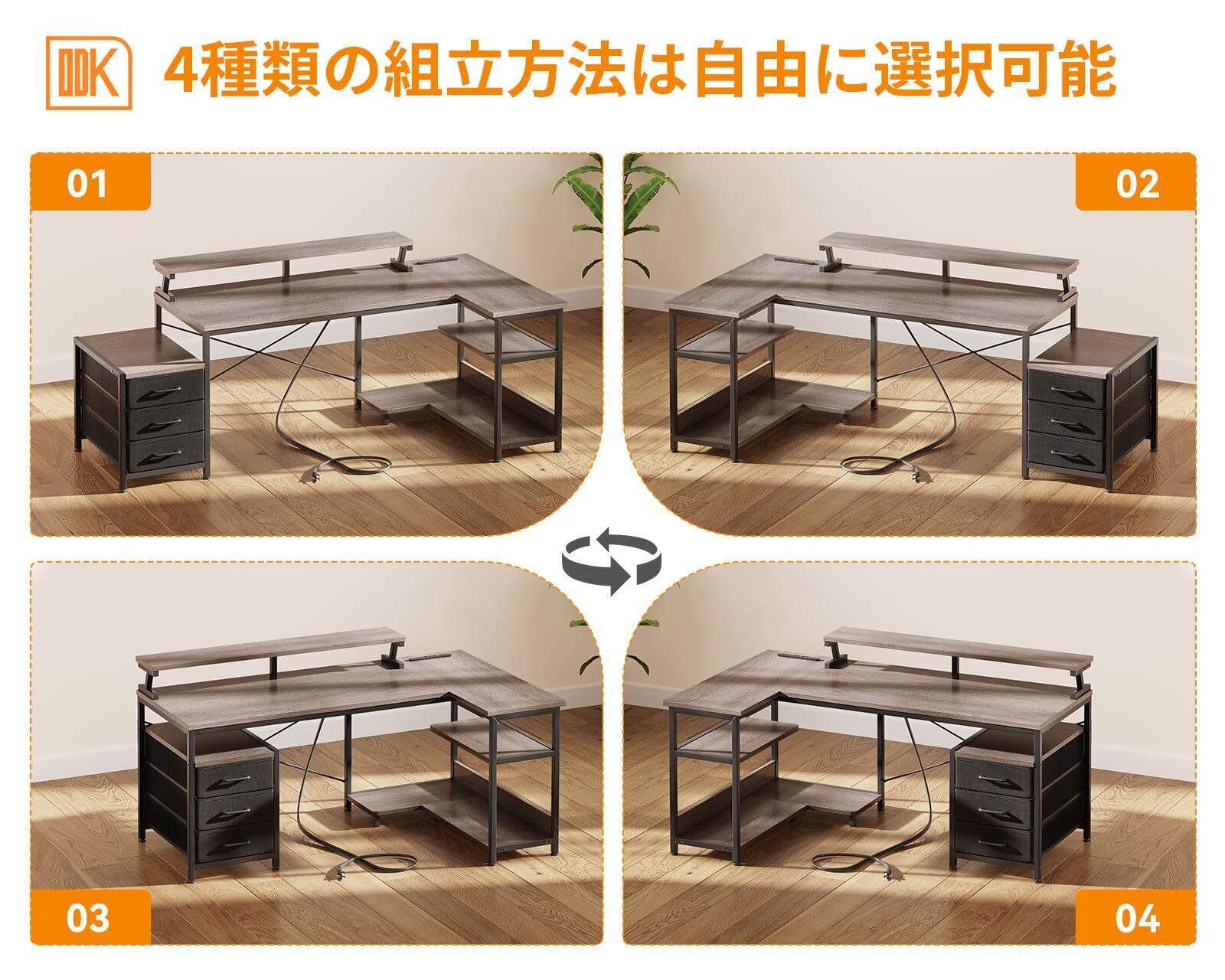ODK パソコンデスク 引き出し3杯付き ゲーミングデスク コンセント付き l字デスク デスク 机 幅184/146*80 pcデスク 棚付き 収納 オフィスデスク 在宅勤務 仕事用 組立簡単 グレー