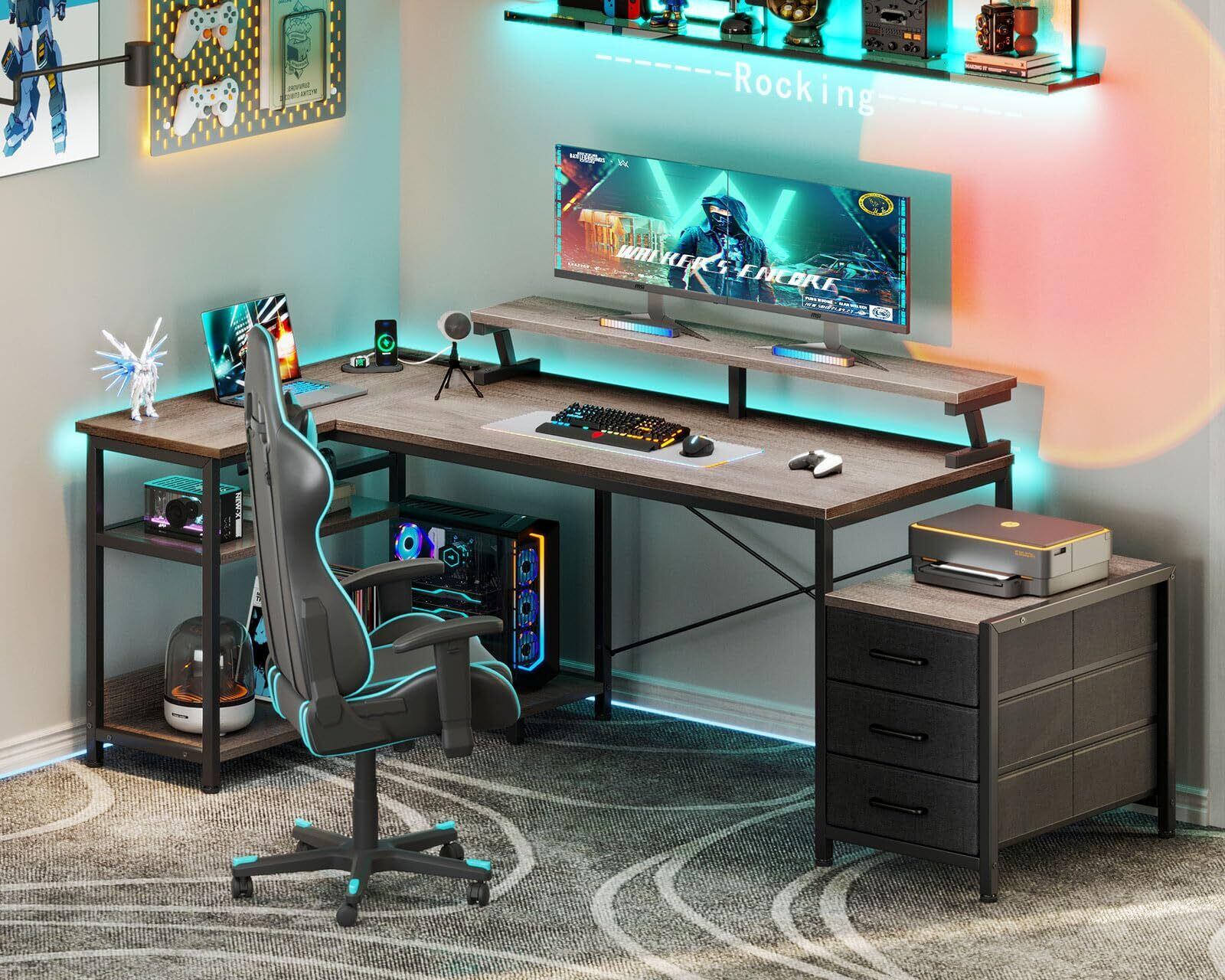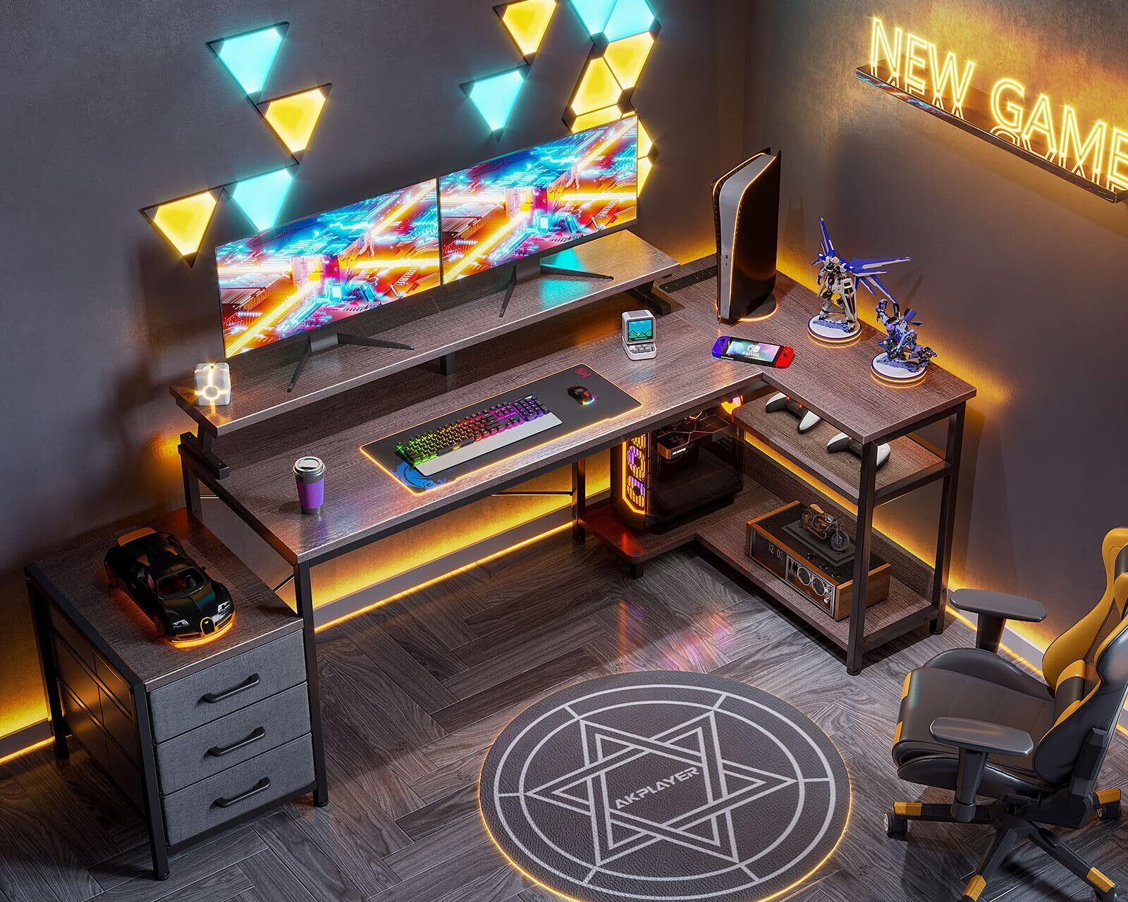 【新着商品】ODK パソコンデスク 引き出し3杯付き ゲーミングデスク コンセント付き l字デスク デスク 机 幅184/146*80 pcデスク 棚付き 収納 オフィスデスク 在宅勤務 仕事用 組立簡単 グレー