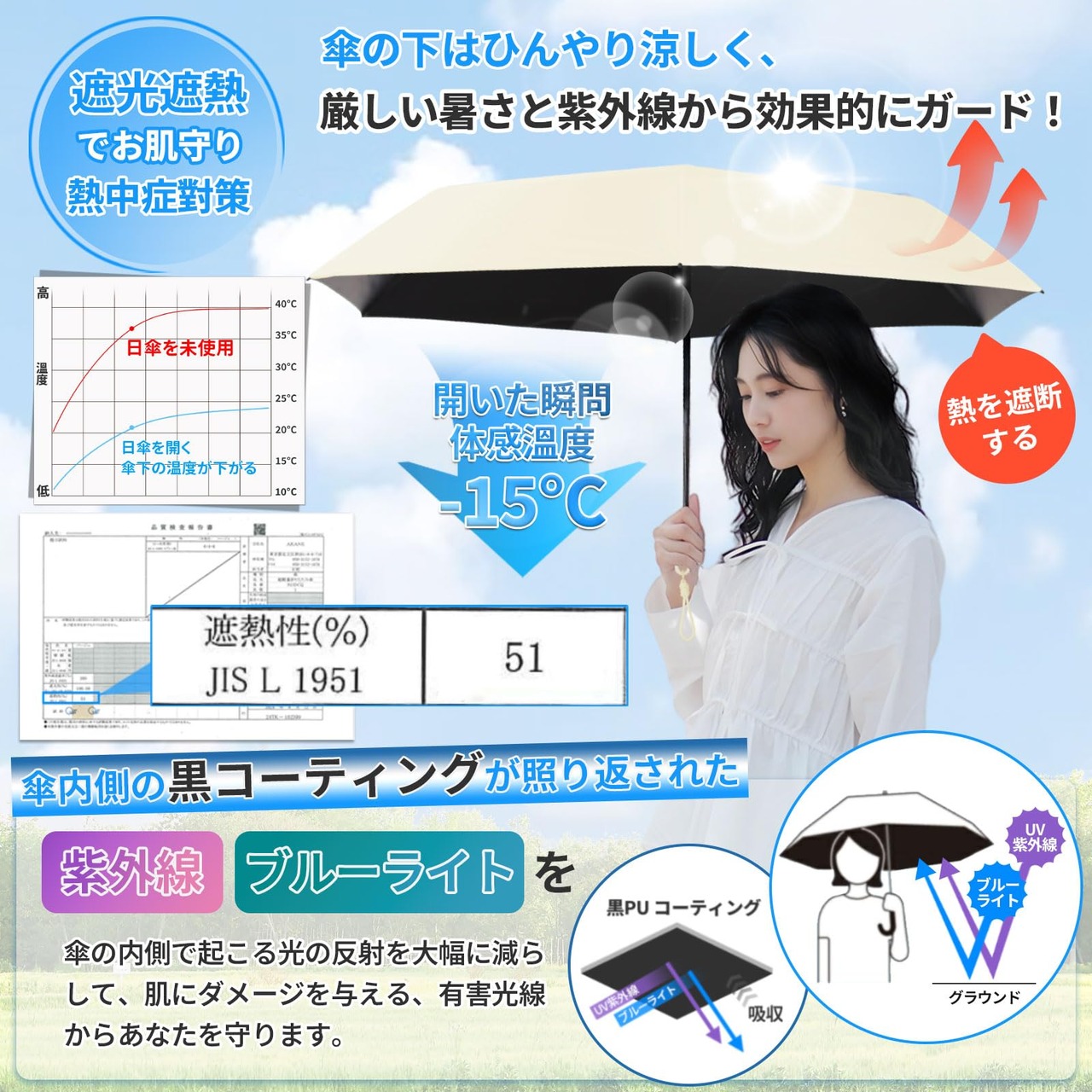 【遮光率・UVカット率100%、UPF50+】この超軽量日傘は、高密度生地に多層の黒ノリコーティングを施しており、UPF50+、UVカット率100%、100%遮光を実現します。効果的に日焼けを防ぎ、肌を日差しや有害な紫外線からしっかりと守ります。日焼け防止や熱中症対策にも役立つため、折りたたみ日傘として常備しておけば、猛暑の日でも安心して外出できます。