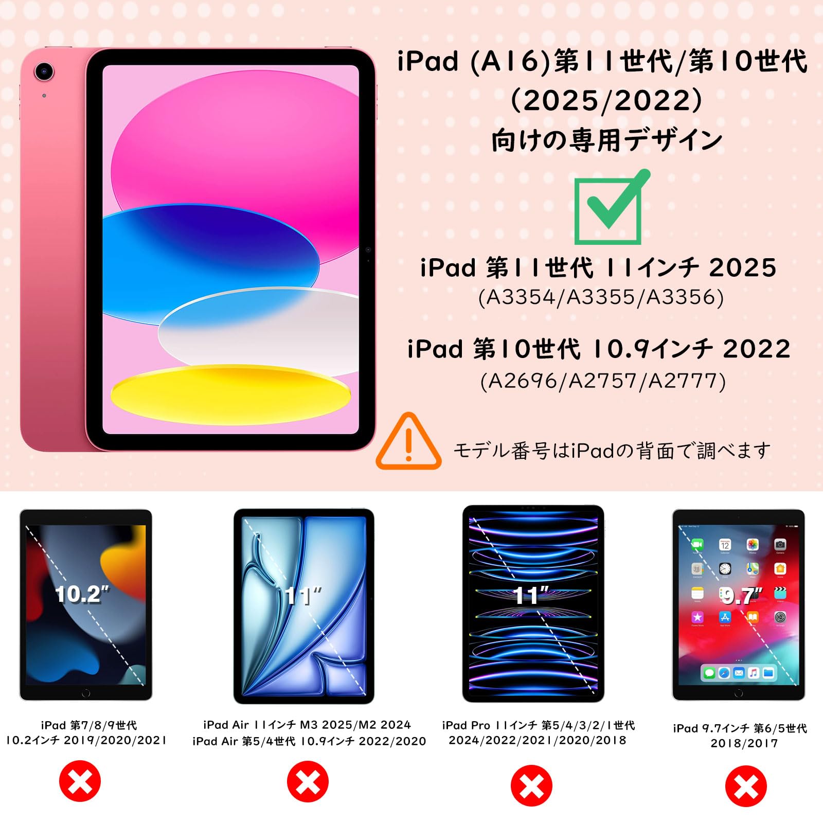 「対応機種」 2025年新発売のNew iPad (A16) 11インチ 第11世代(モデル番号:A3354/A3355/A3356)及び2022年発売の iPad 10.9インチ 第10世代(モデル番号:A2696/A2757/A2777)にカスタム設計しており、iPad Air 11 第7世代(M3)(×)、iPad Air 11 第6世代(M2)(×)、iPad Air 10.9 第5/4世代(×)、又は他のモデルには適用しません。購入する前にタブレットの機種/モデル番号を確認してください。
