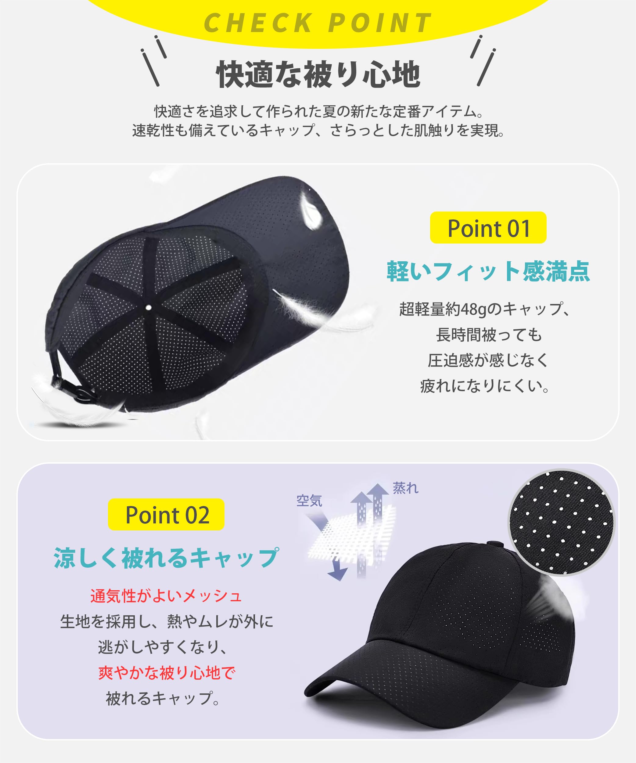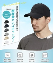 【超軽量キャップ】超軽量・速乾・通気・uvカットと搭載したメンズキャップ。キャップの重さはわずか約48g、被っていることを忘れてしまうほどの軽さ。肌によく馴染むポニーテール生地のメンズキャップ。超軽量素材を採用しており、長時間被っても負担感が感じられなく、軽いフィット感と快適さを叶います。