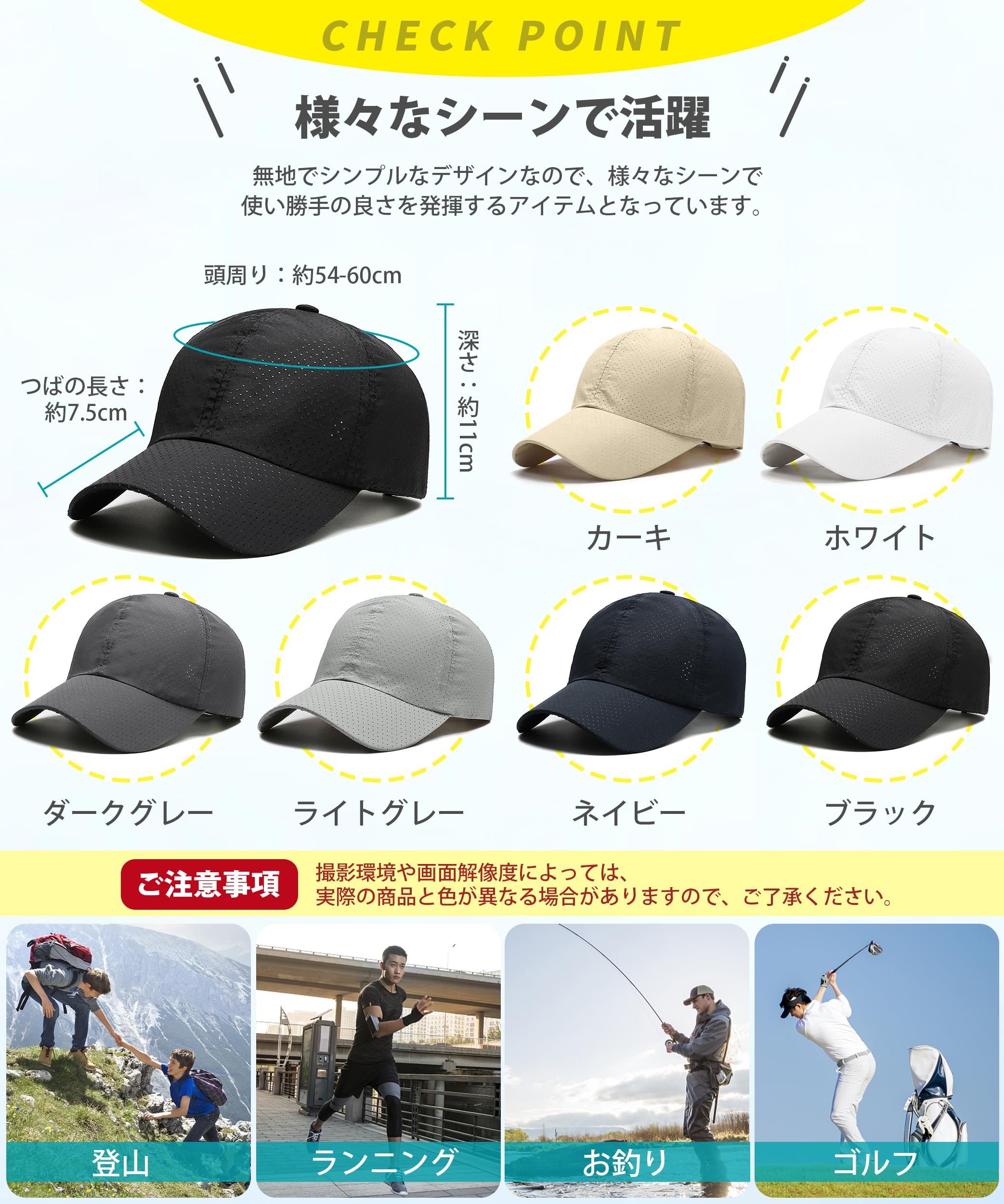 【メッシュ速乾生地】メンズキャップの内部にある熱が外へ逃がしやすいメッシュタイプなので、通気性がよくて蒸れにくい。軽くて薄手のメンズキャップ、吸汗速乾機能もしっかりと発揮し、暑い時期でも爽やかな被り心地を実現できます。汗をかいてもすぐに吸収して、ベタつきにくく細菌の繁殖を抑えられます。ランニング、ハイキング、登山などのスポーツシーンに重宝しています。