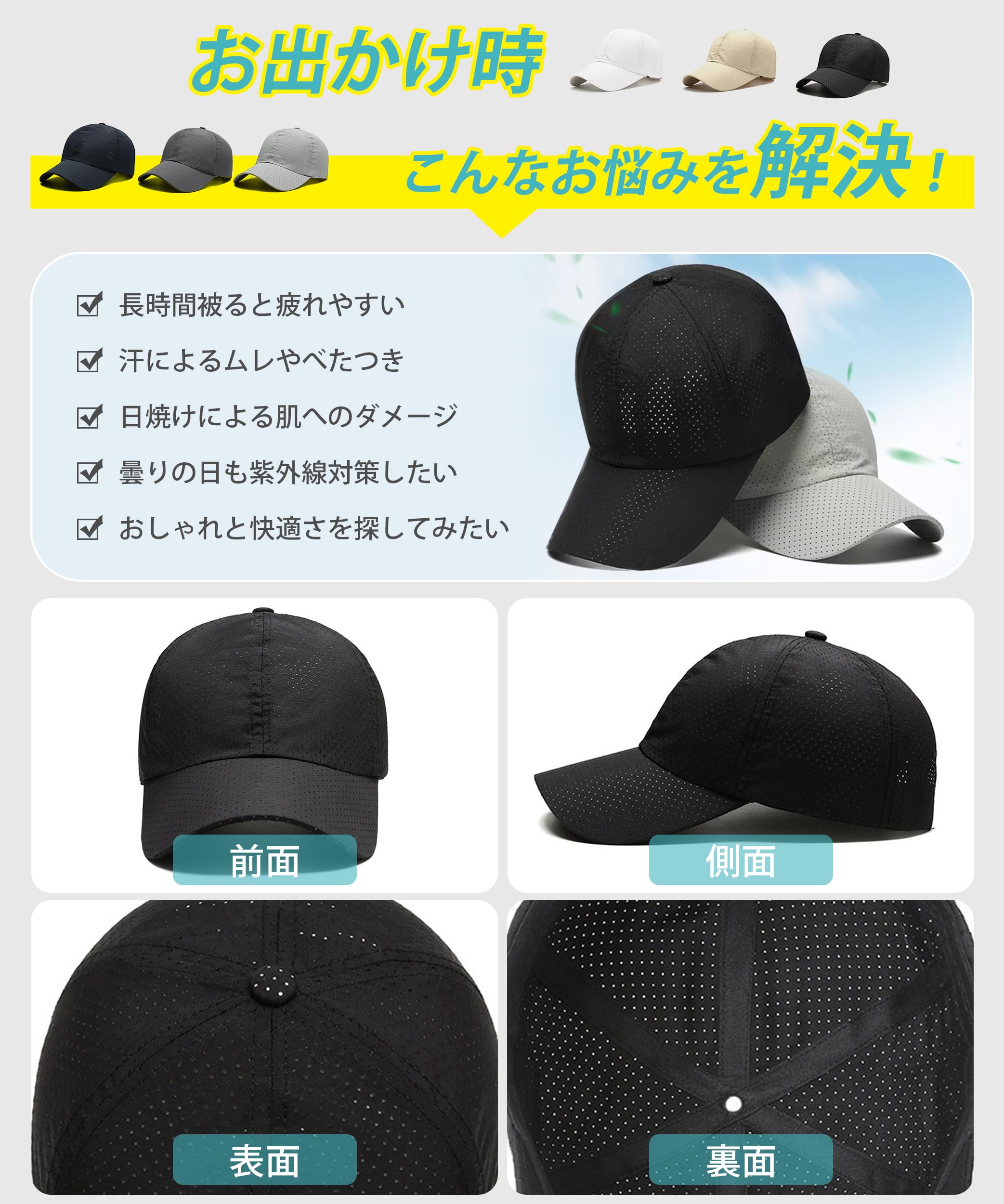 【2022最新】[YUMISS] キャップ メンズ 夏 【約48g超軽量】 【メッシュ速乾生地・良い通気性でサラッと被れ】 uvカット 日除け帽子 つば広 通気 蒸れない 暑くない サイズ調整可 54-60cm 紫外線対策 男女兼用 散歩 ランニング スポーツ