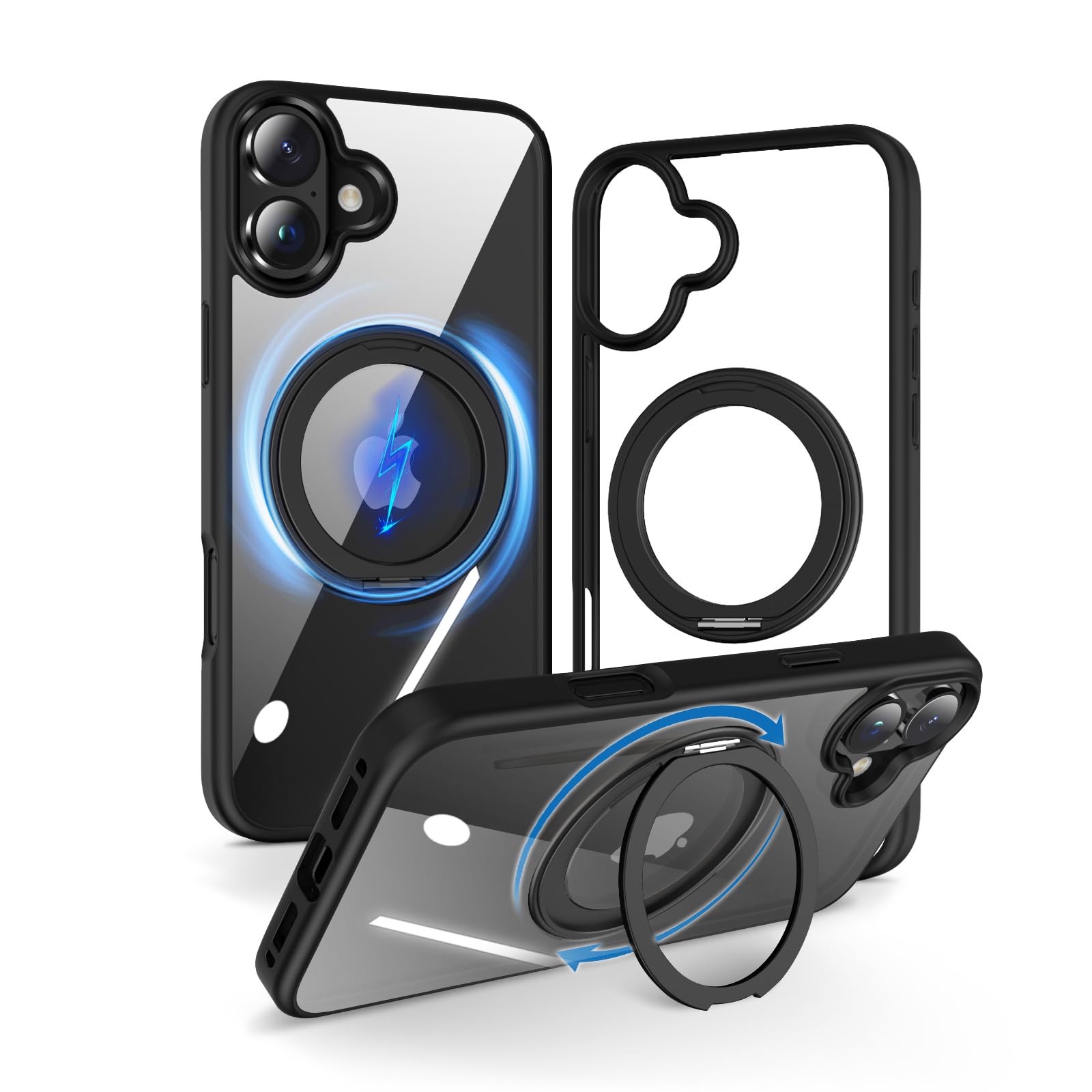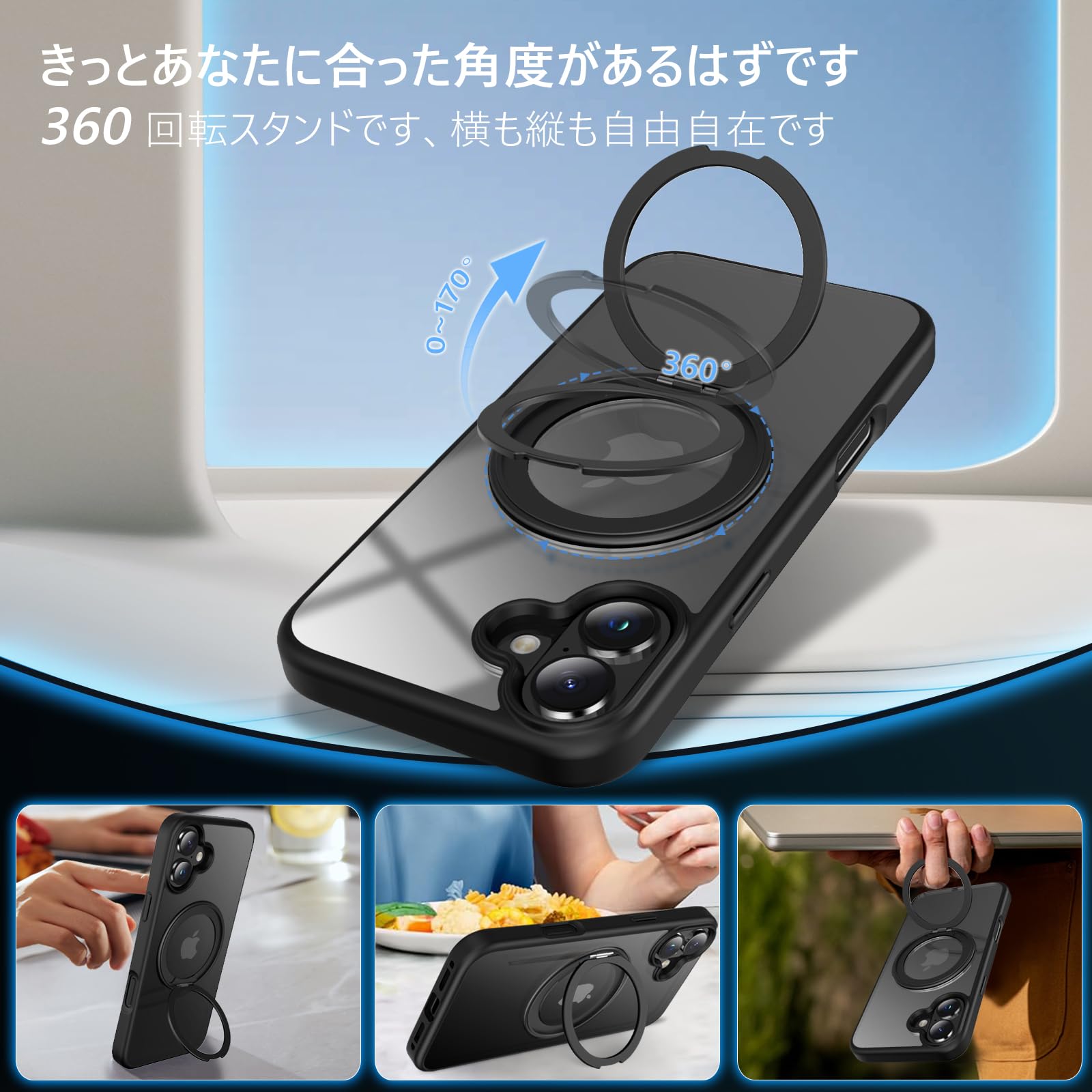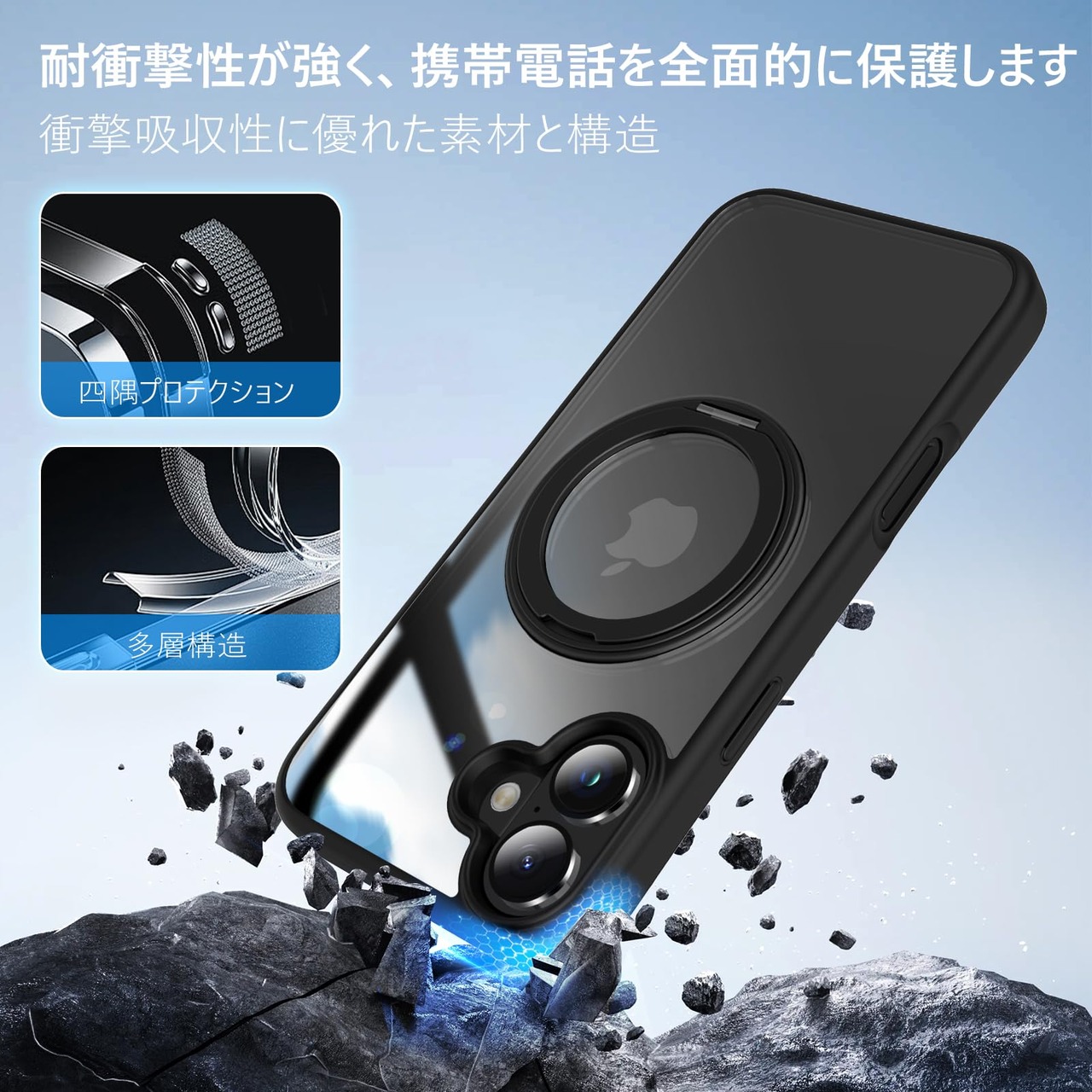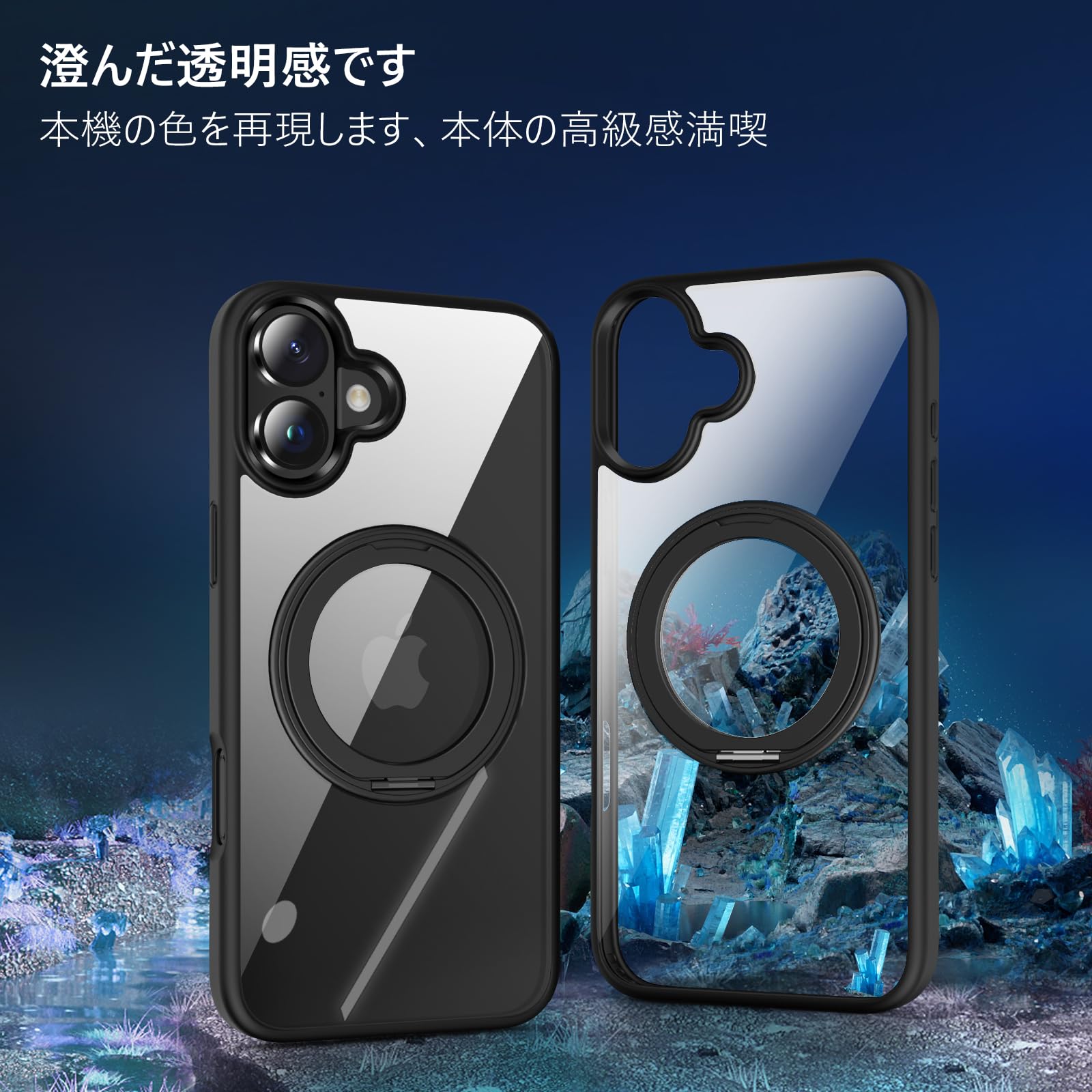 【360度回転スタンド・縦横両対応】KATSUTOYO iPhone 16 用 ケース magsafe 黄ばみにくい iphone16 用 ケース 強磁力リング マグネット搭載 360°回転スタンド 縦横両対応 MagSafe対応 高耐久性 アイホン16 用 ケース 米軍MIL規格 耐衝撃 指紋防止 アイフォン16 用 ケース (6.1インチ)背殻クリア ブラック