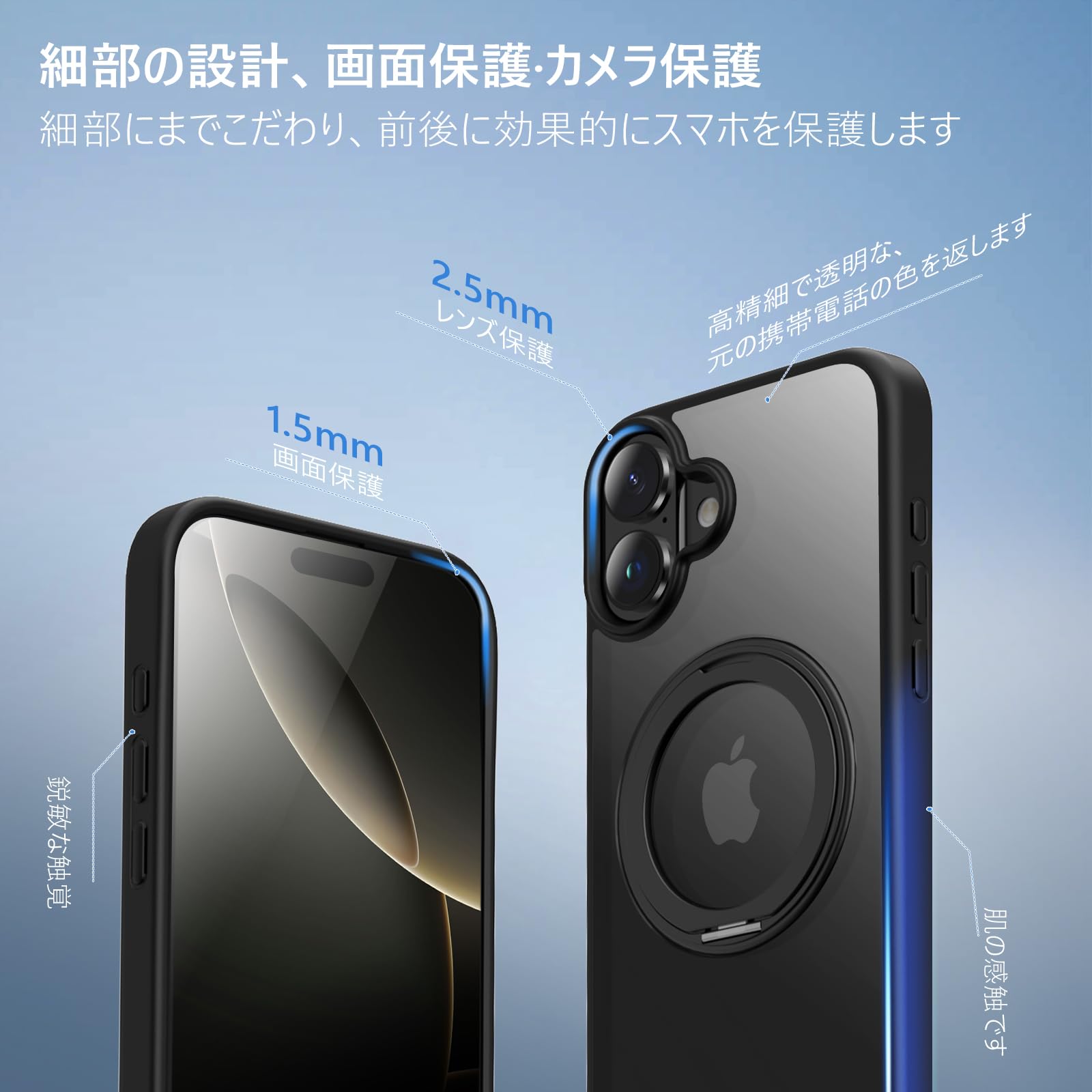 【縦横360度自由回転】アップグレードされた360度回転軸はよりスムーズに回転し、静かでスムーズな回転を実現します。ブラケットのマルチアングル回転により、使用機能が充実します。お好みに合わせて調整でき、スタンドはお好みの角度に機能を調整できます。縦持ちでも横持ちでも、スマートフォンをしっかりと支えられるスタンドです。自然な姿勢でYouTubeや映画、動画視聴、ビデオ通話などを楽しめます。 iPhone 16 用(6.1インチ)の保護ケースです。(iphone16 用 ケース)