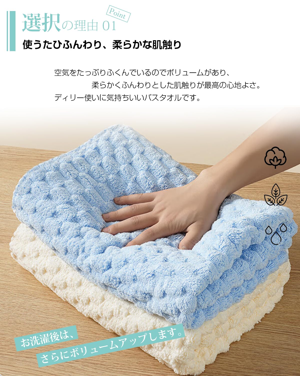 「飽きずに使える立体ポコポコのデザイン」シンプルなバスタオルがいいけど無地のバスタオルはちょっと物足りません。特殊な織りをエ夫してパイルがポコポコの立体構造になっています。ポコポコと浮き上がった柄がさりげなく可愛いです。さらに、「甘撚り製法」を採用して、通常より細い系でパイルを長く織り上げ、纎細な柔らかさに仕上げました。シルクのような独特の光沢感としなやかさがあります。