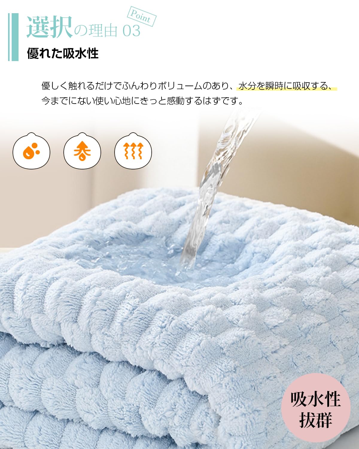 「抜群の吸水性·優れた速乾性」非常に細かい繊維からできている為、優れた吸水性を発揮します。さらに通気性が良いため、水分を素早く乾かします。入浴後の水分をサッと吸収する抜群の吸水力です。さらりとした快適な使い心地です。湿気によるカビや細菌の繁殖を抑えます。梅雨の場合や湿気が多い季節でも、乾き早くていつも清潔を保ちます。洗濯物を乾きにくい時期にも快適で使えます。室内で干しても大丈夫です。