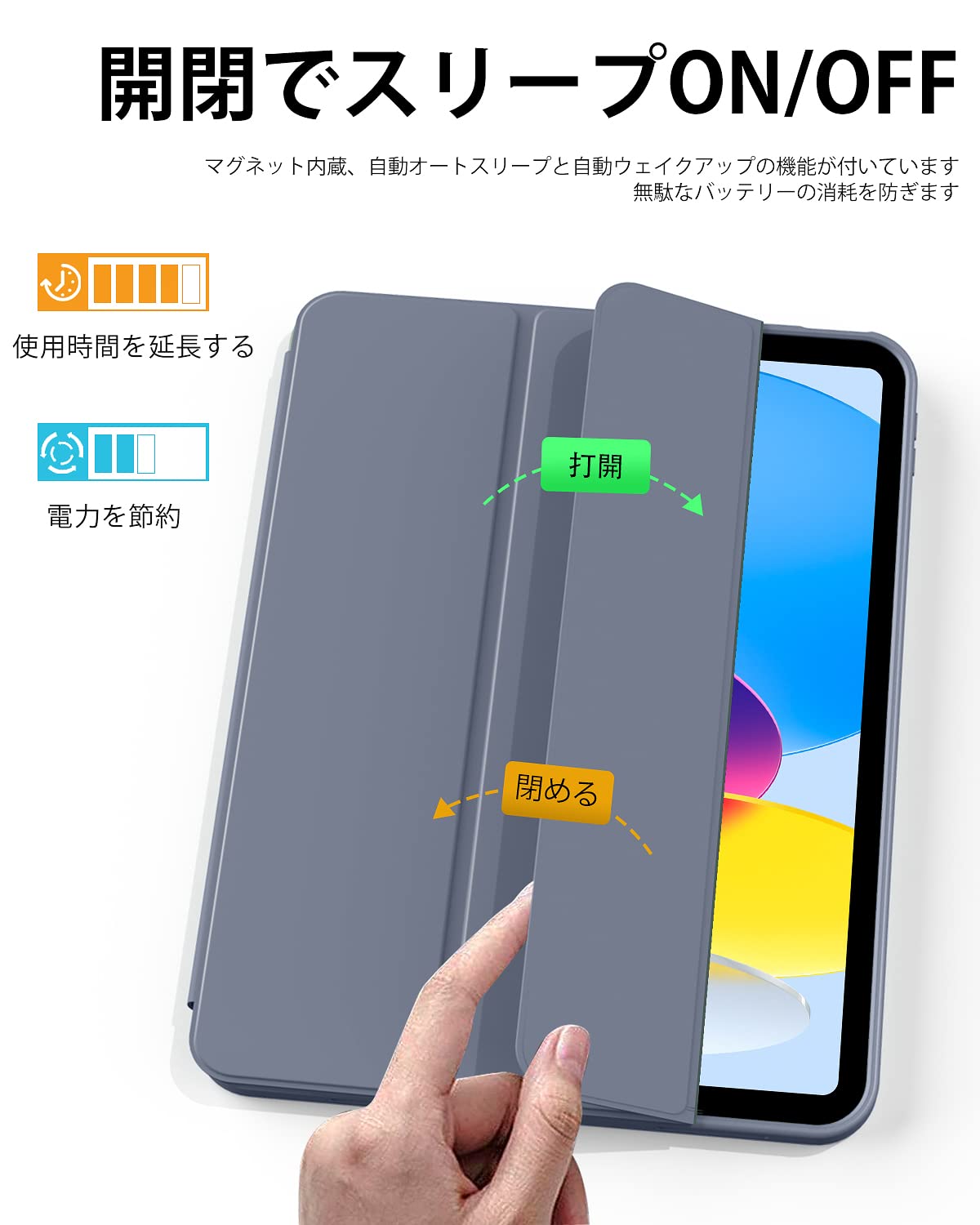 【オートスリープ/ウェイク機能】オートスリープ機能でカバーを開ける閉めることで電源自動的にオン・オフなります、使いやすく、省エネです。マグネット内蔵されているためカバンに入れてもカバーが勝手に開けることを心配必要なくしっかり閉められます。