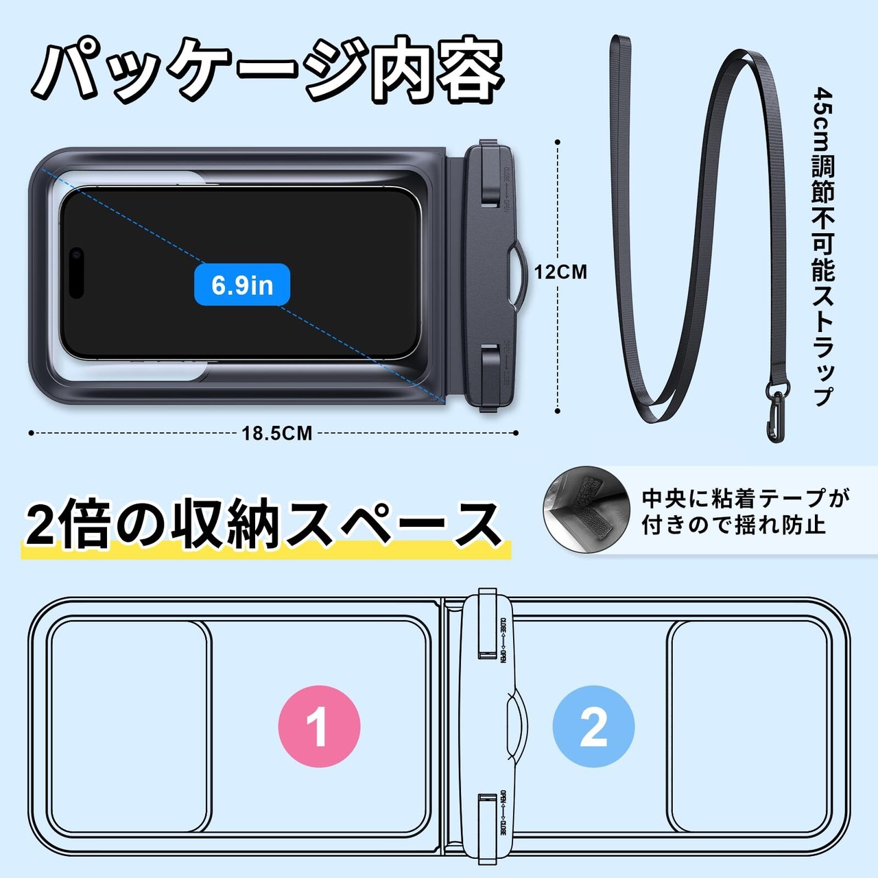 【ママもマリン派も両手フリー】45cmのストラップ付きでハンズフリー快適!スマホを首元に固定すれば両手がスイスイ使えます。水辺のママもマリンスポーツ好きも、落下防止設計で活動中も安心。
