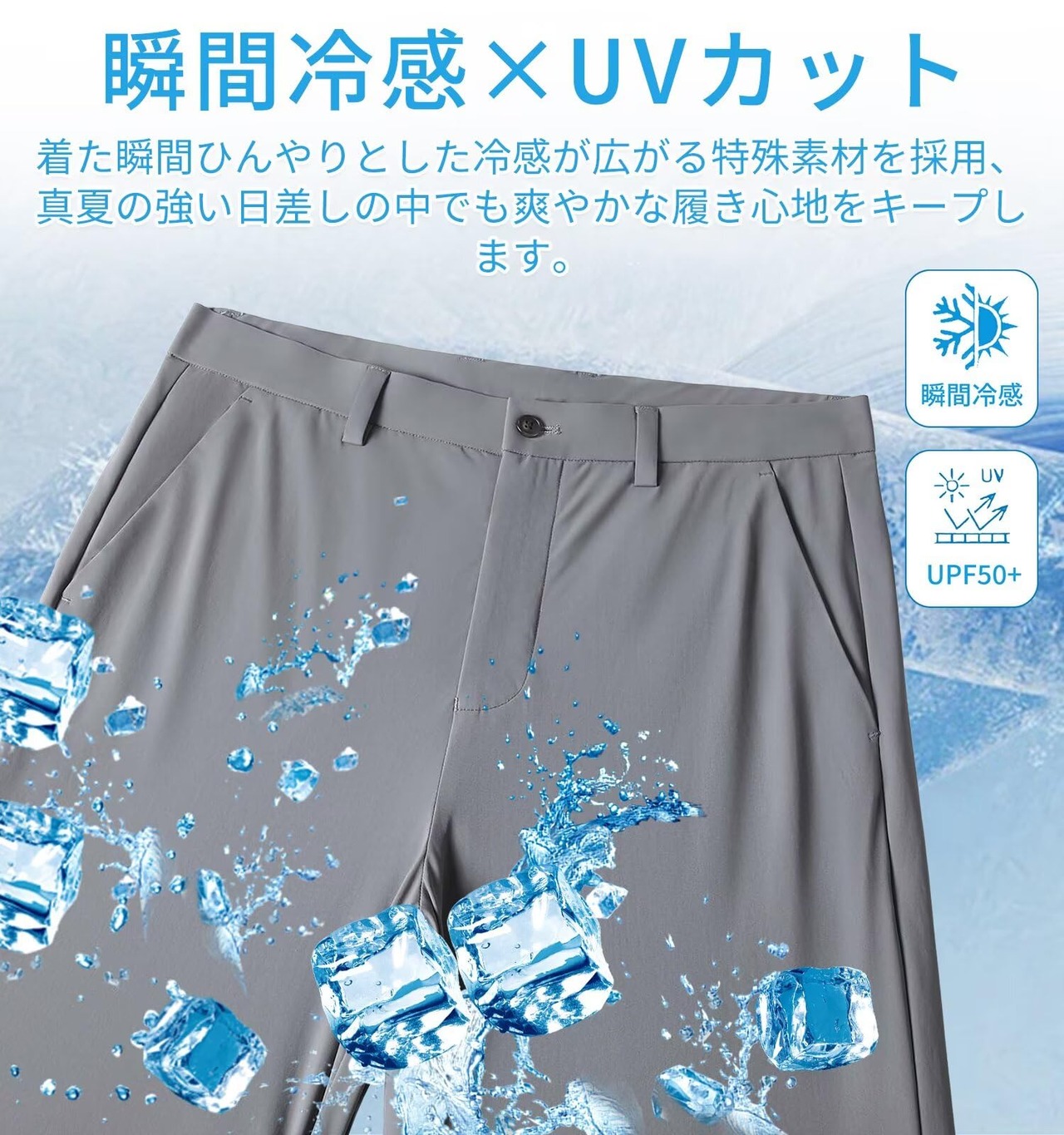 【接触冷感×UVカット】このロングパンツは着た瞬間ひんやりとした冷感が広がる特殊素材を採用。真夏の強い日差しの中でも、UPF50+の優れたUVカット機能でしっかり紫外線をブロック。通気性にも優れており、汗ばむ季節でもムレにくく、爽やかな履き心地をキープします。