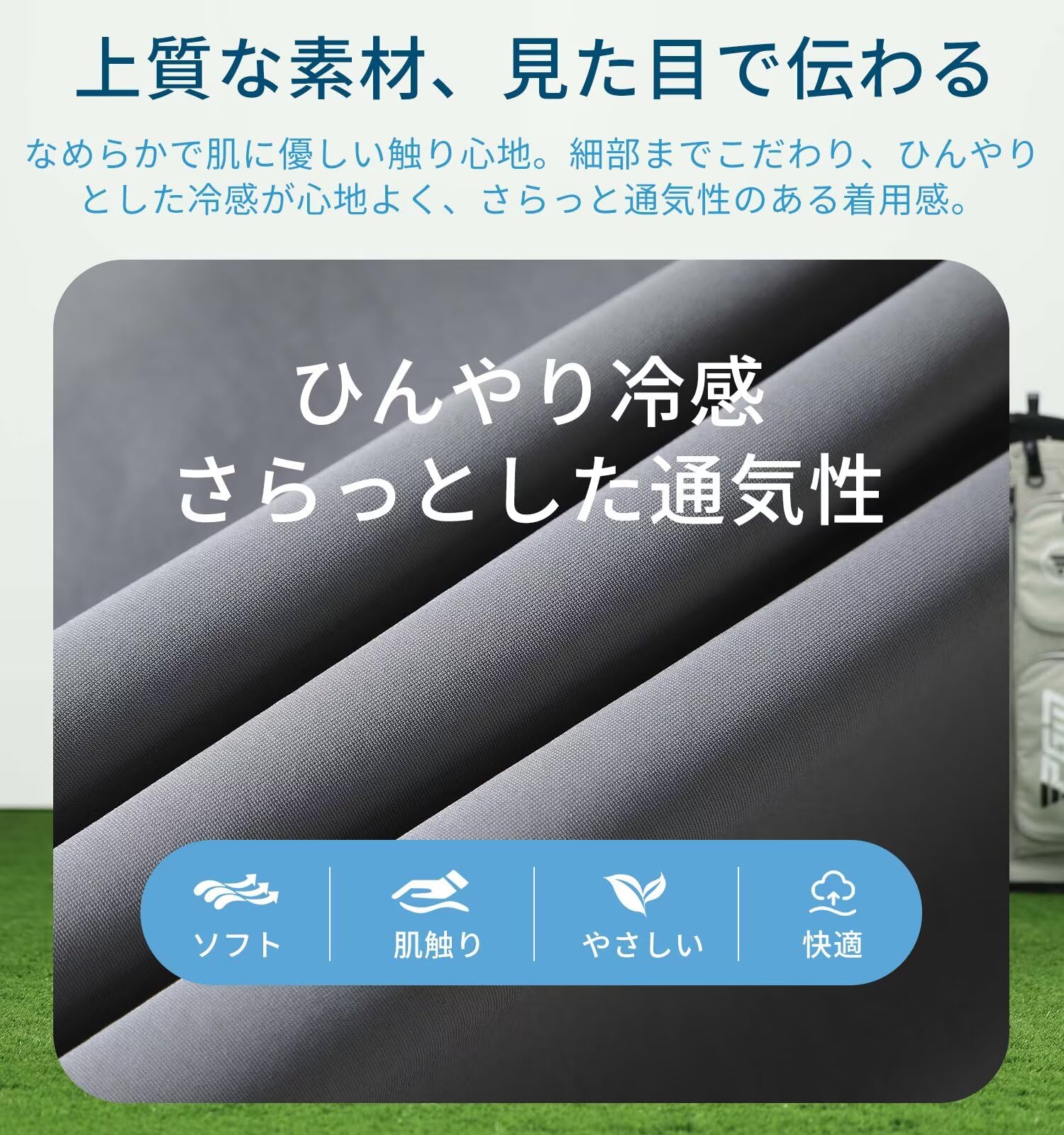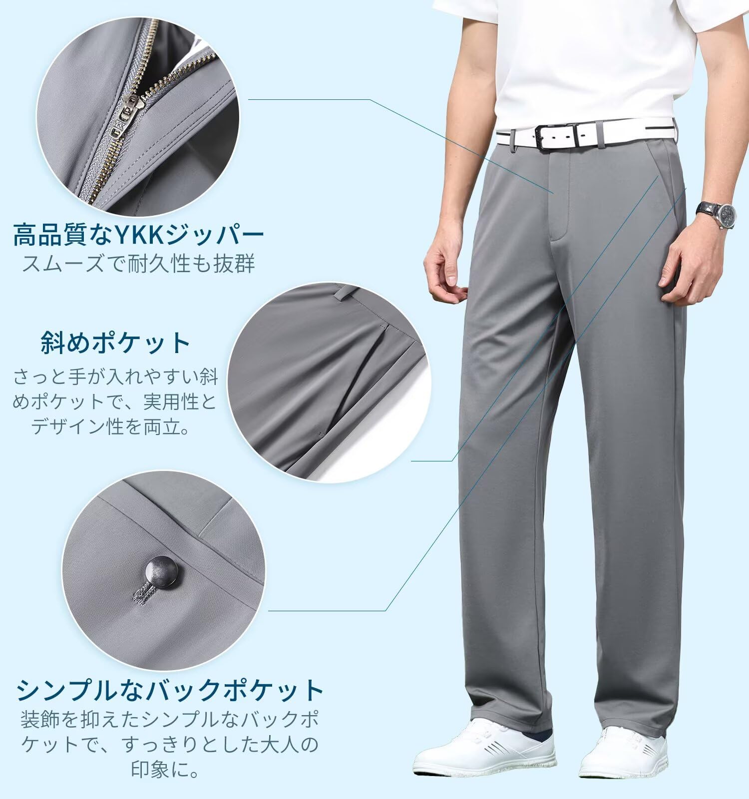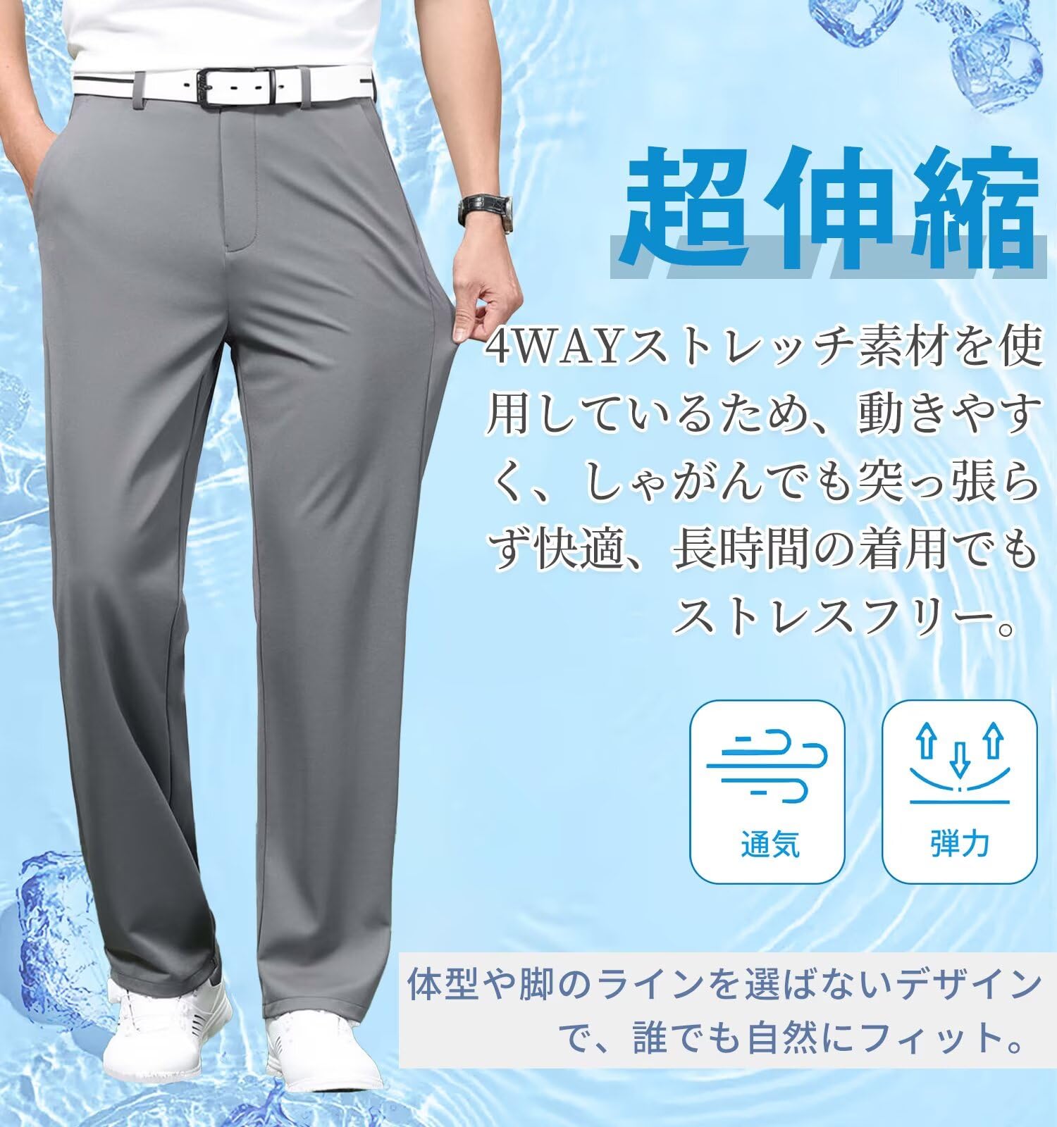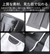 【真夏も快適なスラックス】ナイロン81.3%、スパンデックス18.7%のアイスシルク生地を採用。ひんやりとした接触冷感で、熱を吸収しにくく素早く放熱。肌にやさしく、抗菌効果もあり、真夏でも快適な履き心地を実現します。