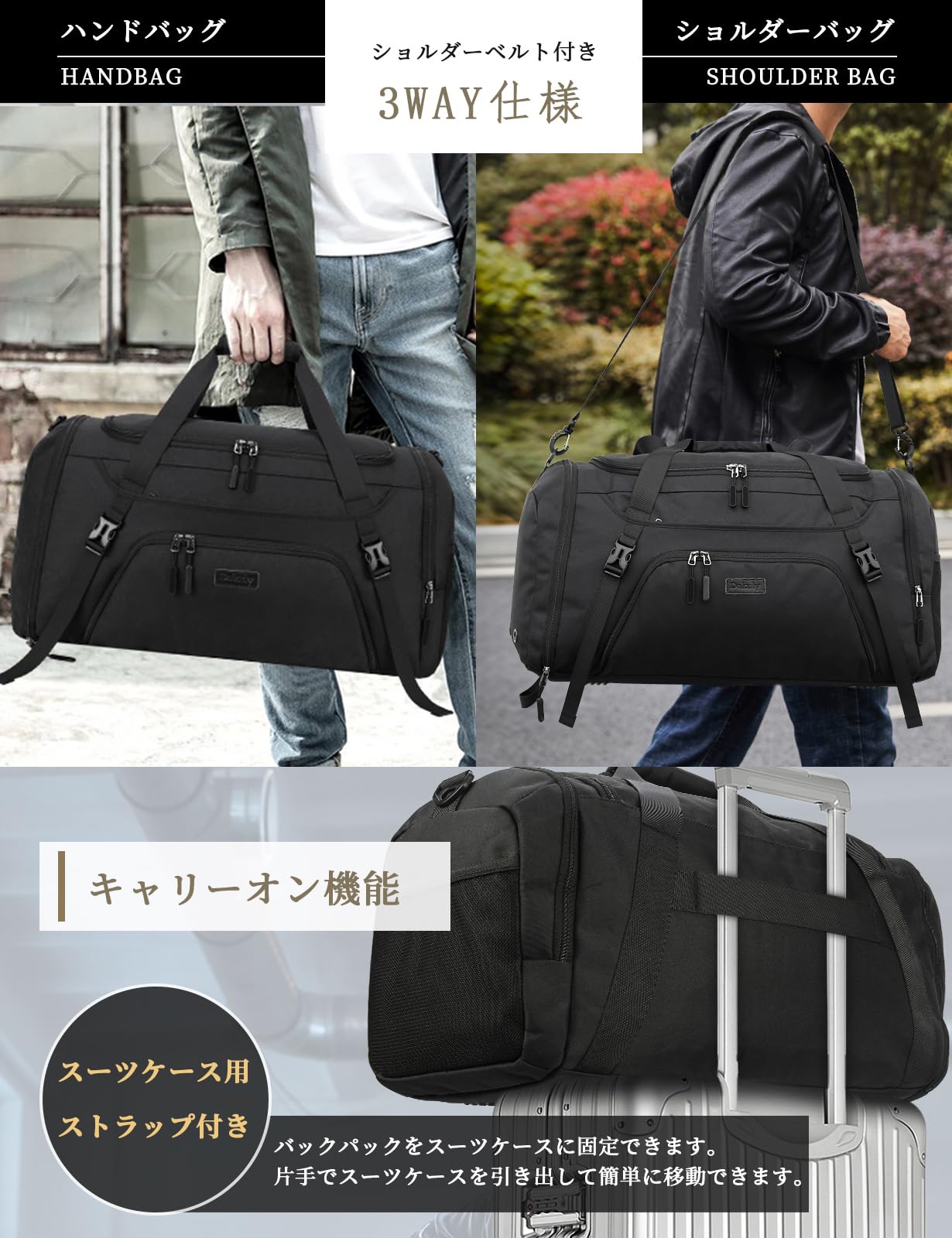 「 3wayタイプ 」:手持ち、肩掛け、キャリーオンバッグとして3wayで使えます。長さが調節できるショルダーストラップが付き、ハンドバッグとしても、ショルダーバッグとしても使えます。旅行や出張に行くときには、キャリーオンバッグを使えるようになります。それに、持ち手部分を使って肩がけすることもできますよ。