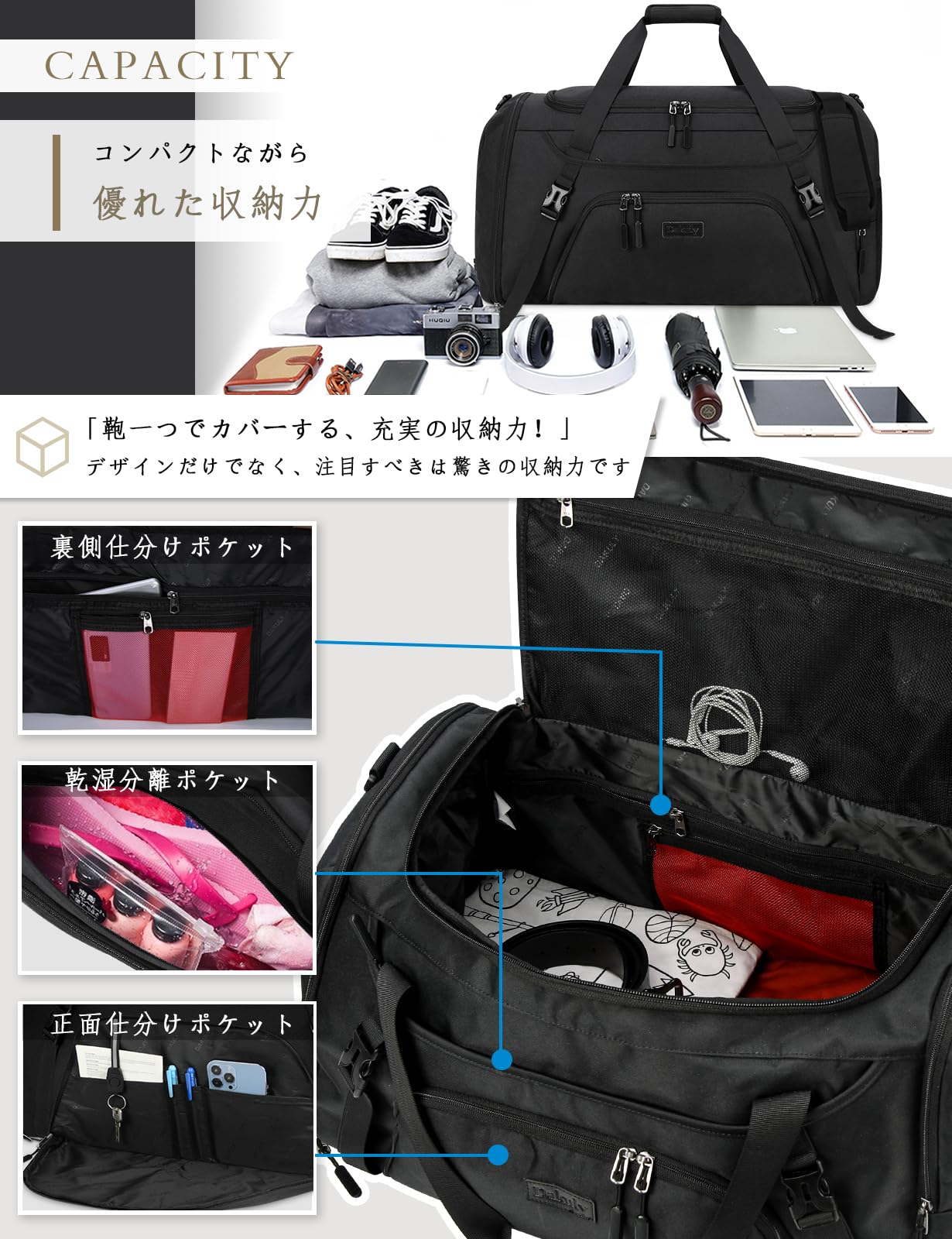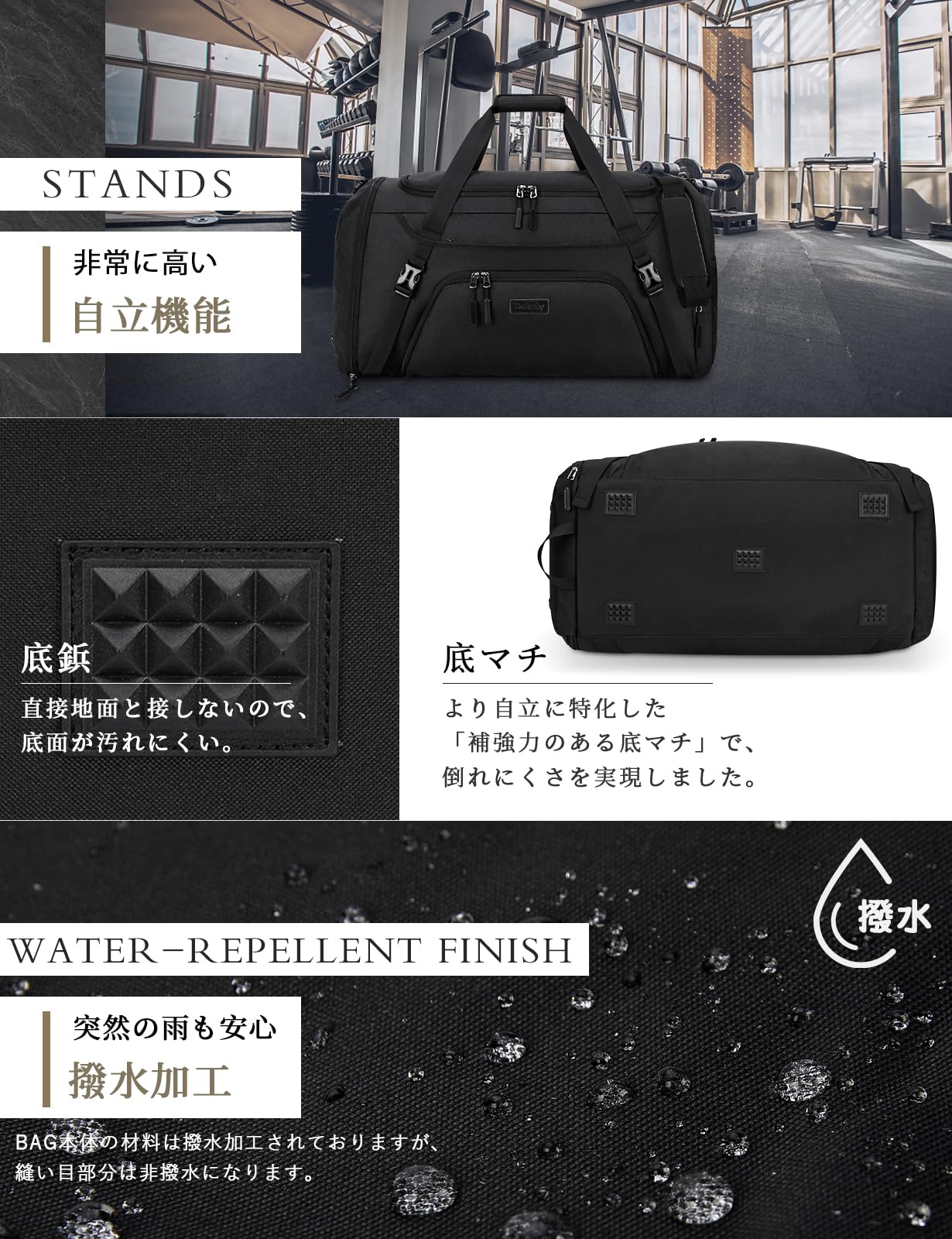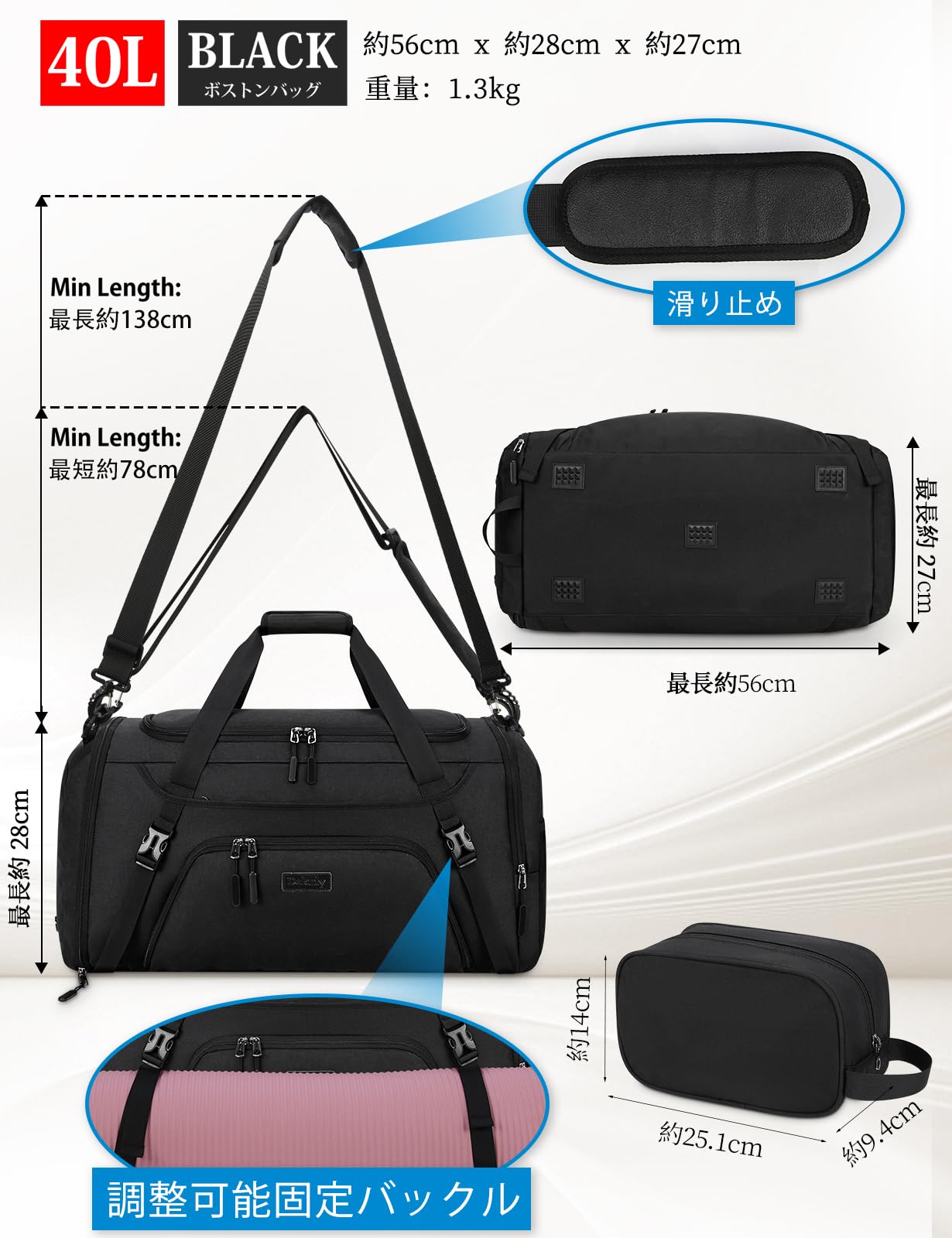 スポーツバッグ メンズ ボストンバッグ 大容量 修学旅行 旅行バッグ YKKファスナー 撥水加工 乾湿分離 ジムバッグ 40L 55L シューズ収納 斜めがけ 手提げ 肩掛け 男女兼用 black-40L