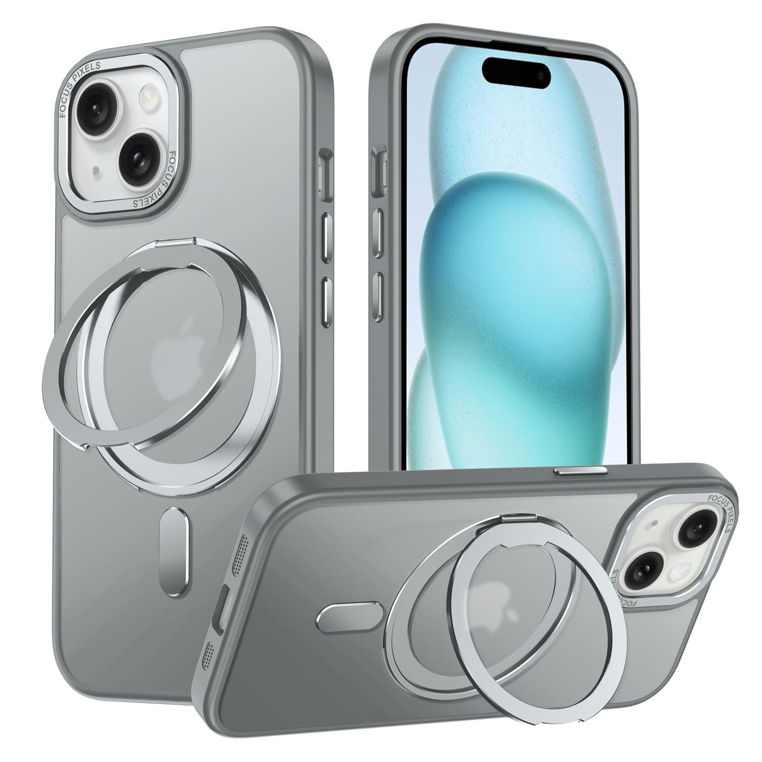 iPhone 15 用 ケース Magsafe対応 アイフォン15 カバー 360°回転スタンド Uovon スマホケース アイホン15 携帯ケース ワイヤレス充電 車載ホルダー 対応 ストラップ穴付き 指紋防止 半透明 黄变防止 ・ グレー