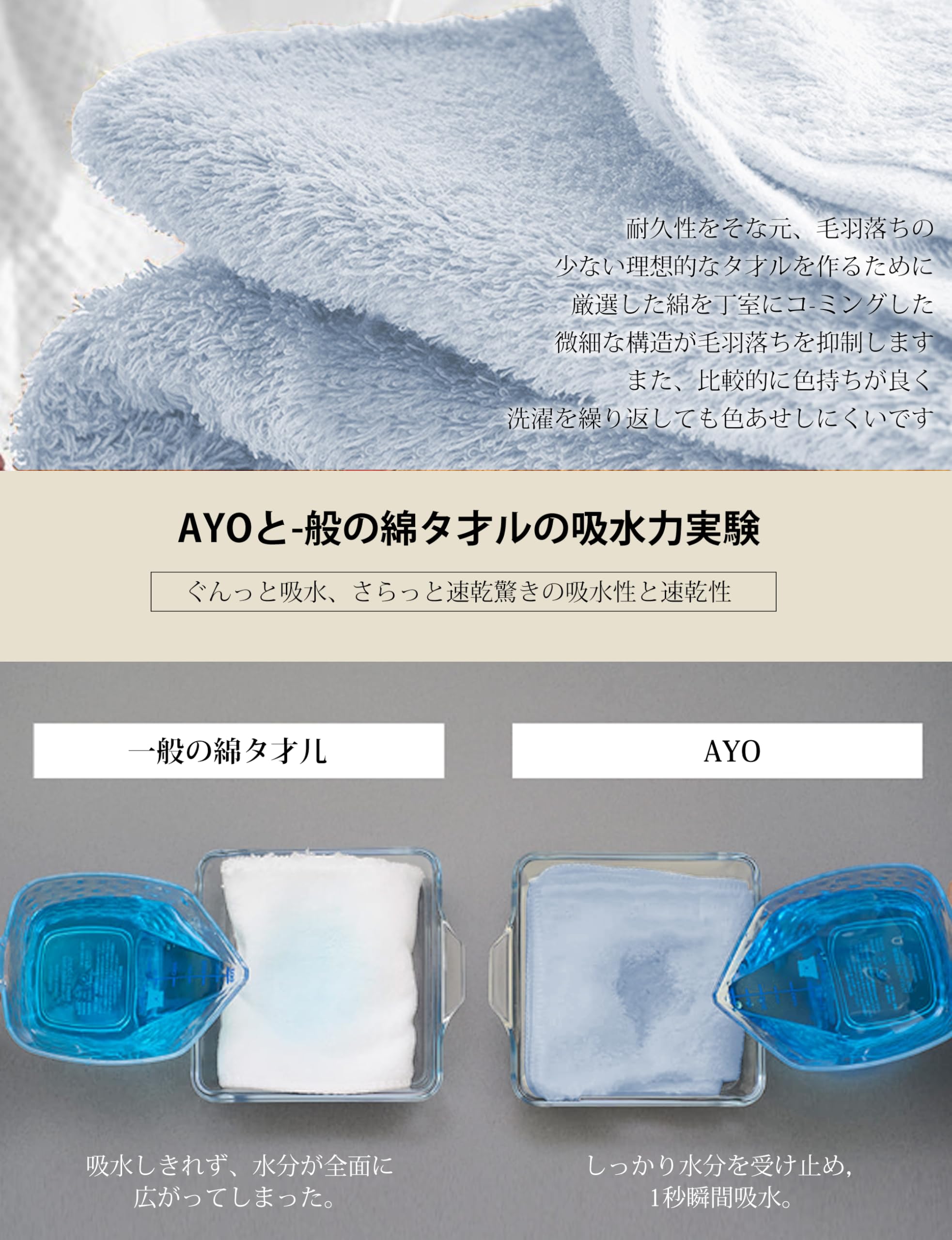 【優れた吸水力と速乾性】サイズ:約60×120cm、素材:綿100% 太番手のコ-マ綿糸をロングパイルで軽やかに織り上げることで、ふわっとたっぷリの空気を含み、同時に水分もくんくん吸い上げる構造が生まれます。「吸水スピード」「吸水量」「吸水方向」、といった吸水力のすべてを高次元でを兼ね備えました。髪や肌など濡れている部分に軽く当てただけで、水分を吸収できます。