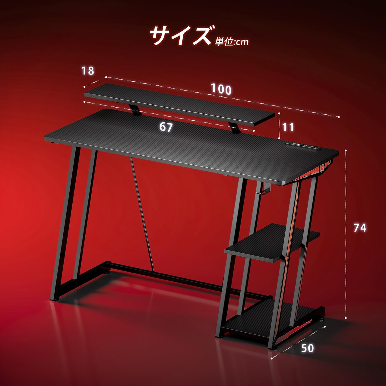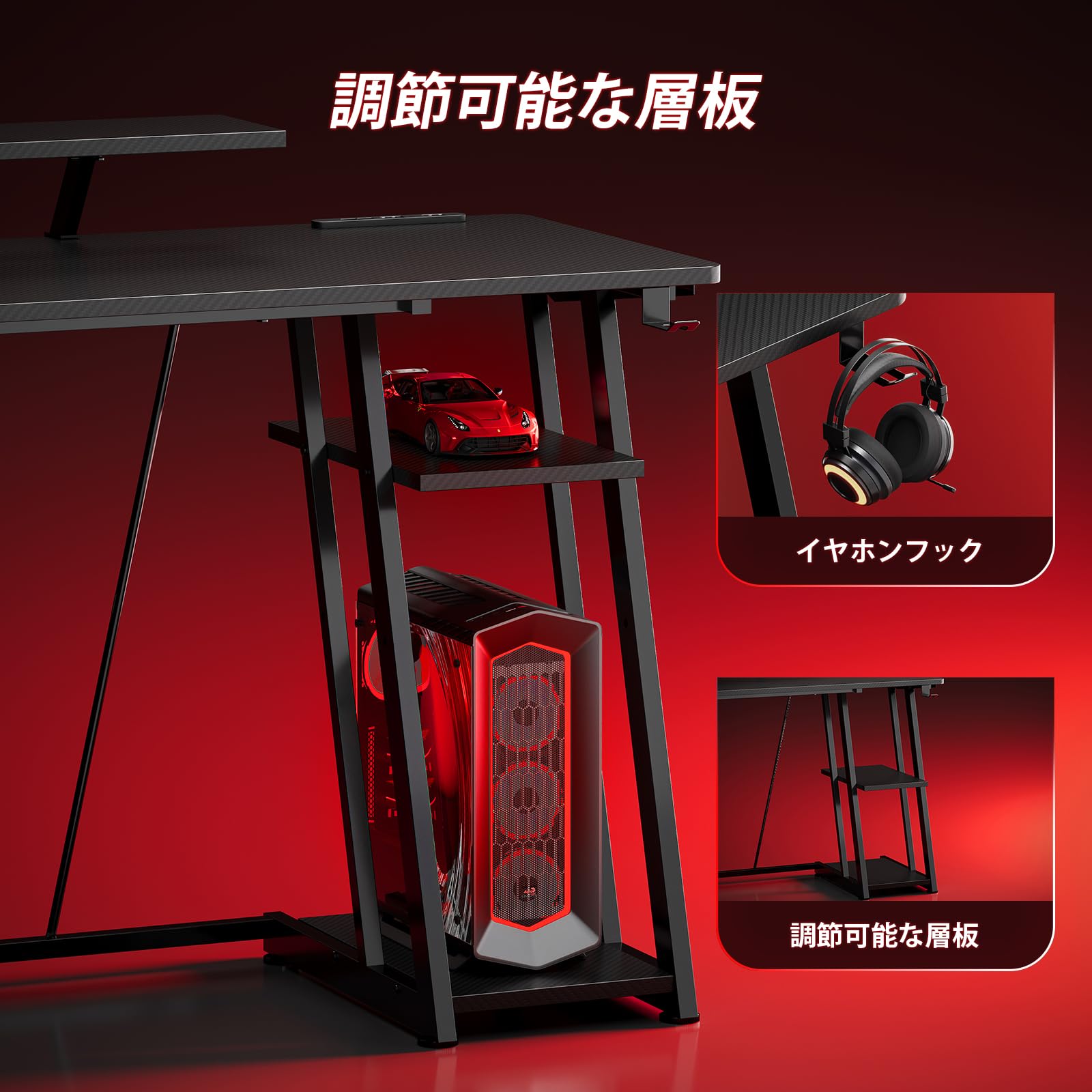 【収納デスク パソコンデスク】 2段調整可能な棚でPC周辺機器を整理収納。ヘッドセットフックとケーブルホール付き。スチール製頑丈フレームで長期間使用可能。