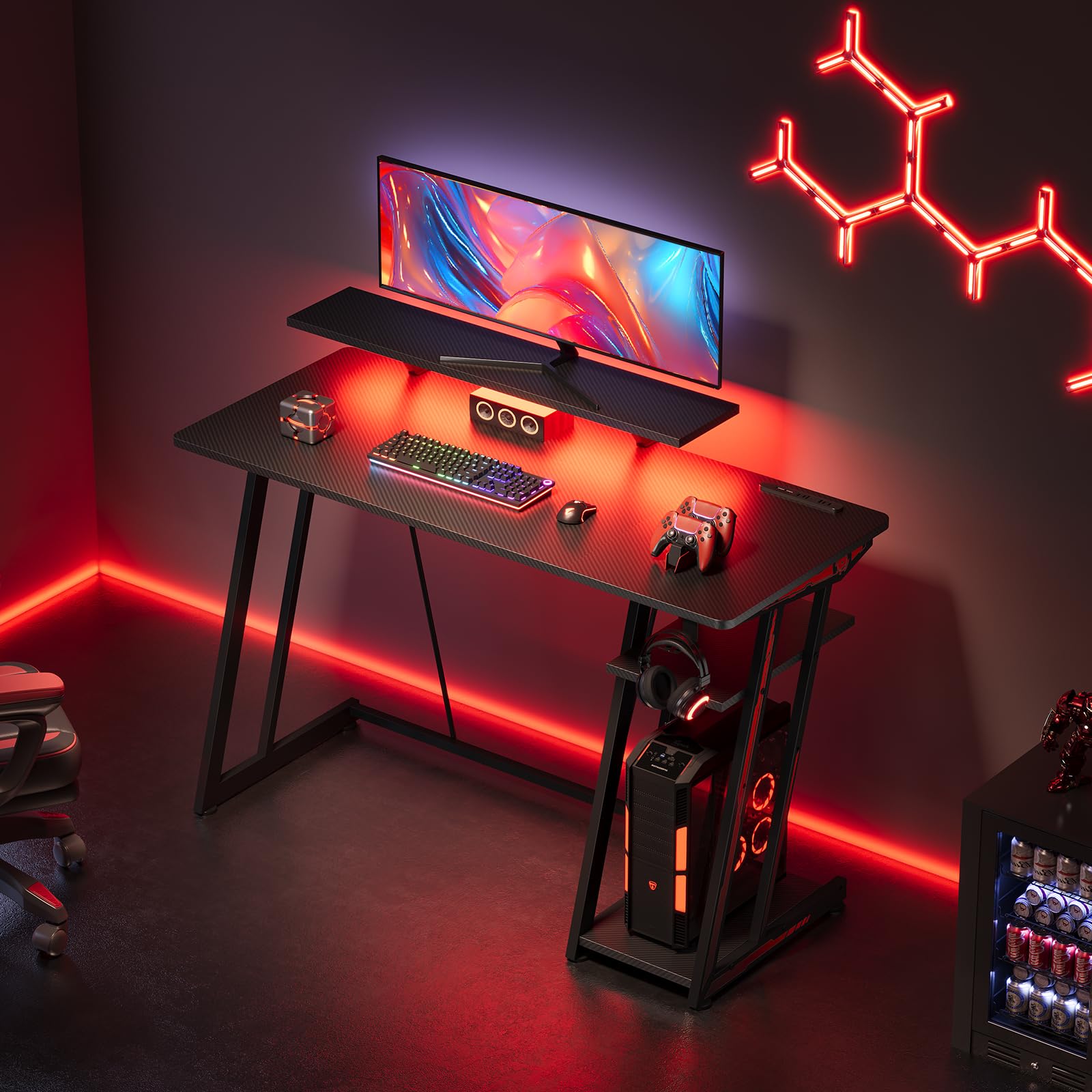 【ゲーミングデスク LEDデスク 100cm】 RGBマルチカラーLED搭載でゲームの臨場感を演出。Z型フレーム設計で安定性抜群。ACコンセントとUSBポート内蔵で配線スッキリ。100cm幅のコンパクトサイズで省スペース。