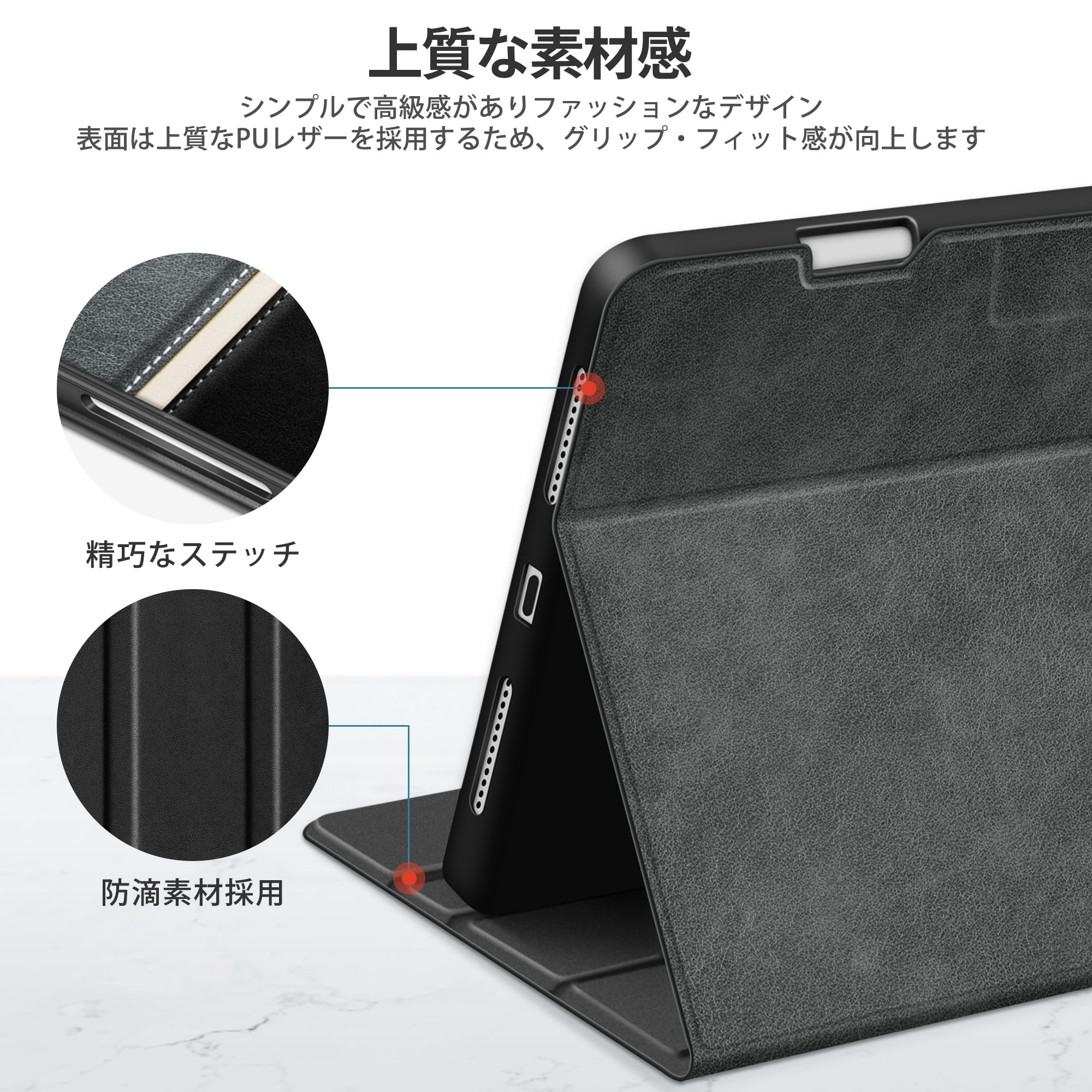 【全面保護・衝撃吸収】高柔軟性があるTPU、耐久性に優れたPUレザーなどの素材採用しており本体を優しく守ります。iPadケースとカメラやディスプレイに高低差があり、高いところから落とした場合でもiPadへの衝撃を吸収し、液晶画面が割れないよう設計されています。