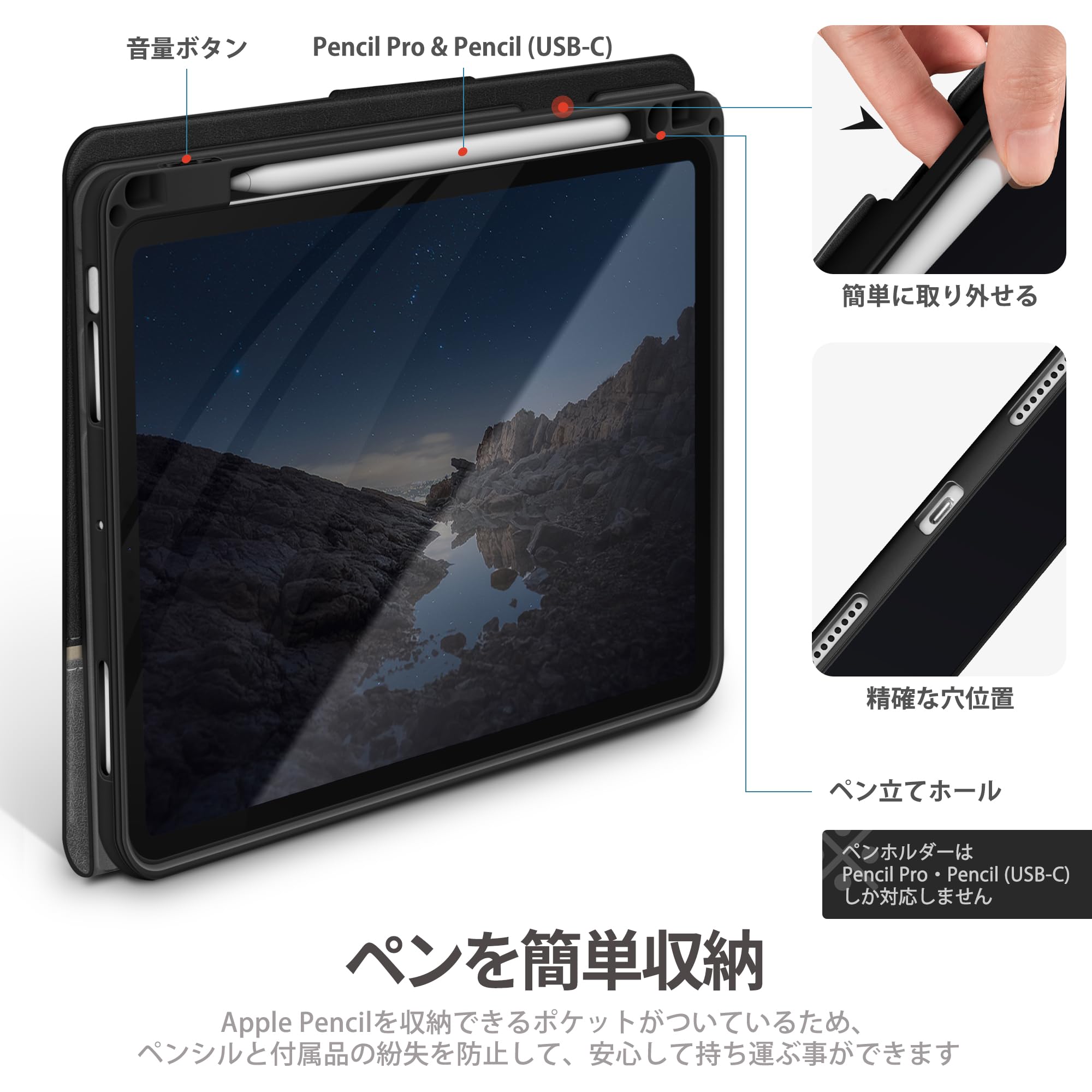 【ペンシル収納可能】Apple Pencil Pro/USB-Cがピッタリ入るペンホルダーがケースについており、 持ち運びにとても便利です。横にある穴はペンスタンドとしてお使いいただき、紛失防止にも役だちます。️ご注意:アップルペンシルは付属しておりません。