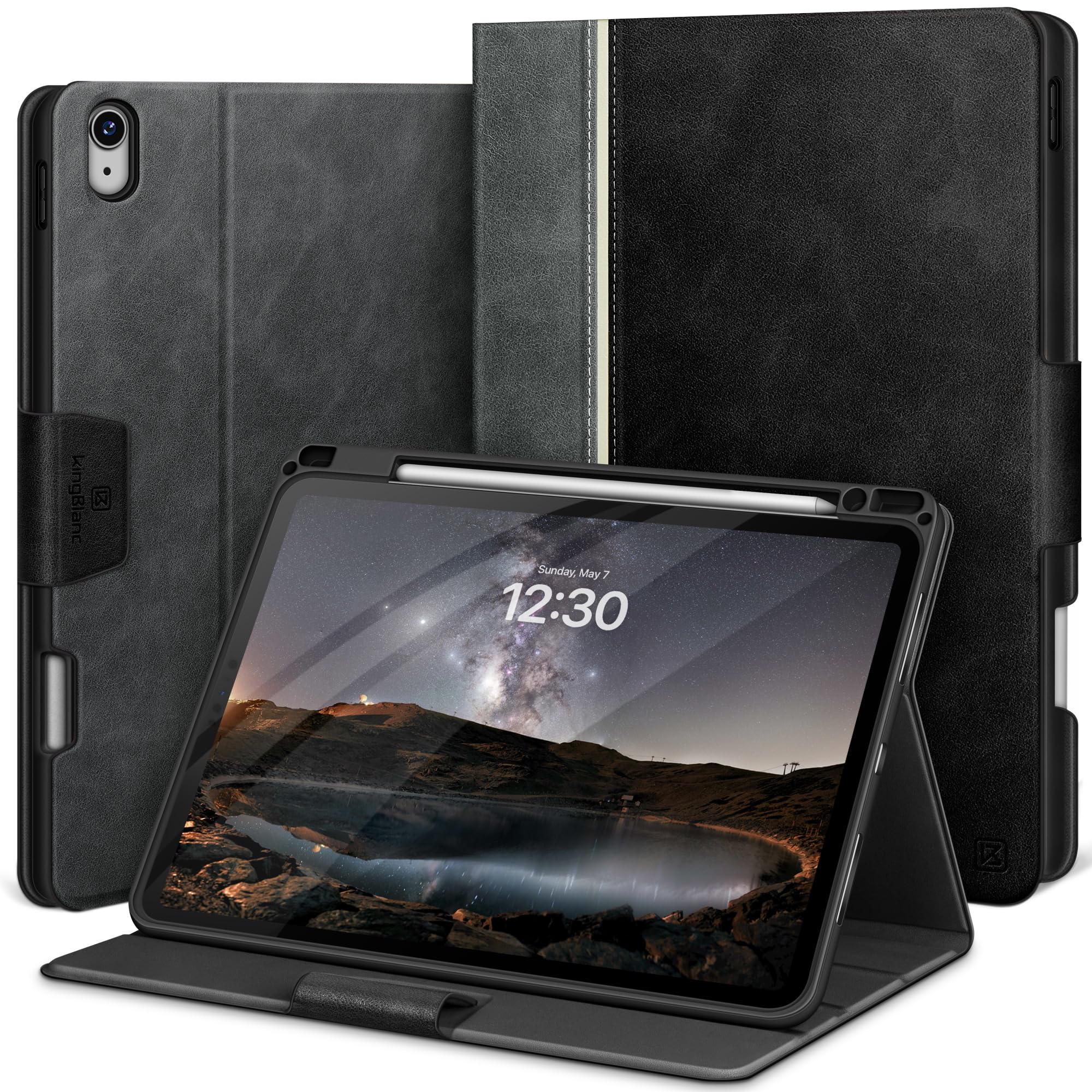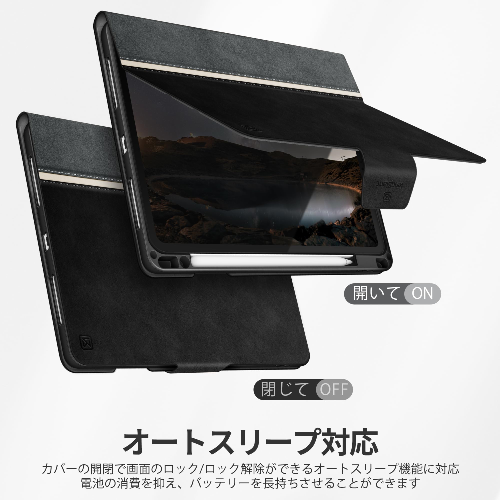 KingBlanc iPad Air 13インチ ケース (M3/M2、2025/2024) 専用 手帳型 ペン収納可 Apple Pencil Pro/USB-C対応 オートスリープ ペンシルホルダー付き 高級PUレザー製 絵描き角度 全面保護 耐衝撃 傷つけ防止 頑丈 カバー ブラック