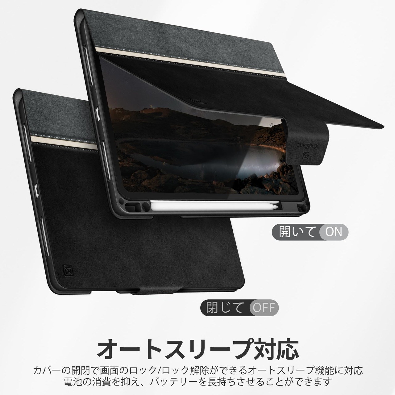 【オートスリープ/ウェイク対応】カバーを開くと画面がついて閉じると消える。iPadケースには欠かせないオートスリープ機能を搭載しています。バッテリーが無駄に消費してしまうのを防ぎます。