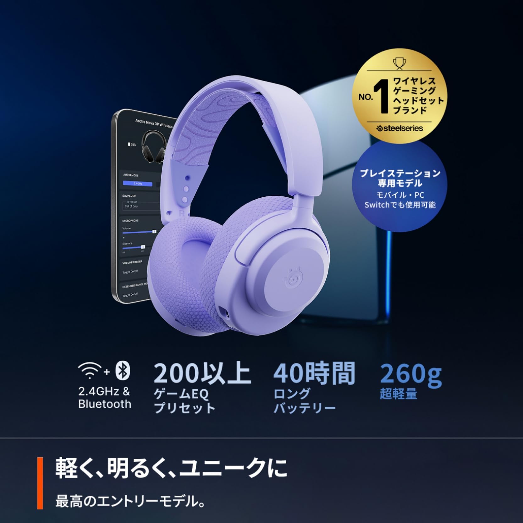SteelSeries ゲーミングヘッドセット ヘッドホン Arctis Nova 3PW Lavender 軽量 ワイヤレス 密閉型 PC PS5 PS4 Switch 対応 RGBライティング AIノイズキャンセリング 空間オーディオ Hi-Fiサウンド 調整可能 61692 ラベンダー