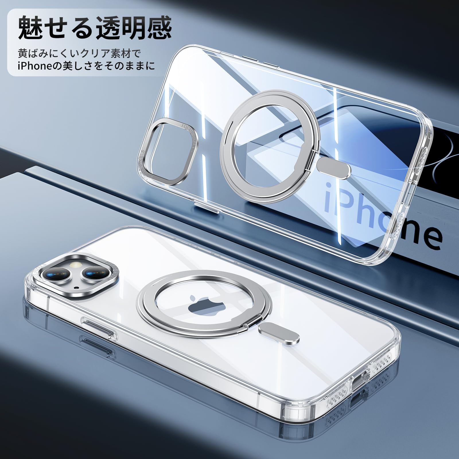 iPhone 15 適用 ケース Magsafe対応 アイフォン15 カバー 360°回転スタンド Uovon スマホケース アイホン15 携帯ケース ワイヤレス充電 車載ホルダー 対応 ストラップ穴付き 透明 指紋防止 黄变防止 ・ クリア