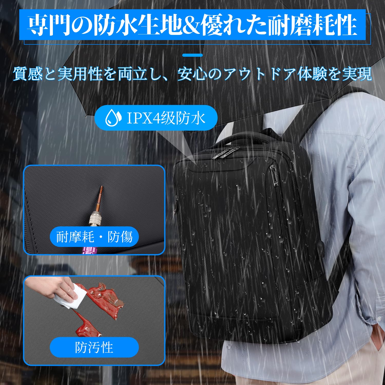 【IPX4級防水&キズ防止生地】このビジネスリュックは、4級の防水性能を誇り、日常の雨の日でも安心してお出かけできます。耐磨耗性に優れたオックスフォード生地を使用して、キズに強く、引き裂きにも負けないタフさ、簡単にお手入れできるので、長持ちします!
