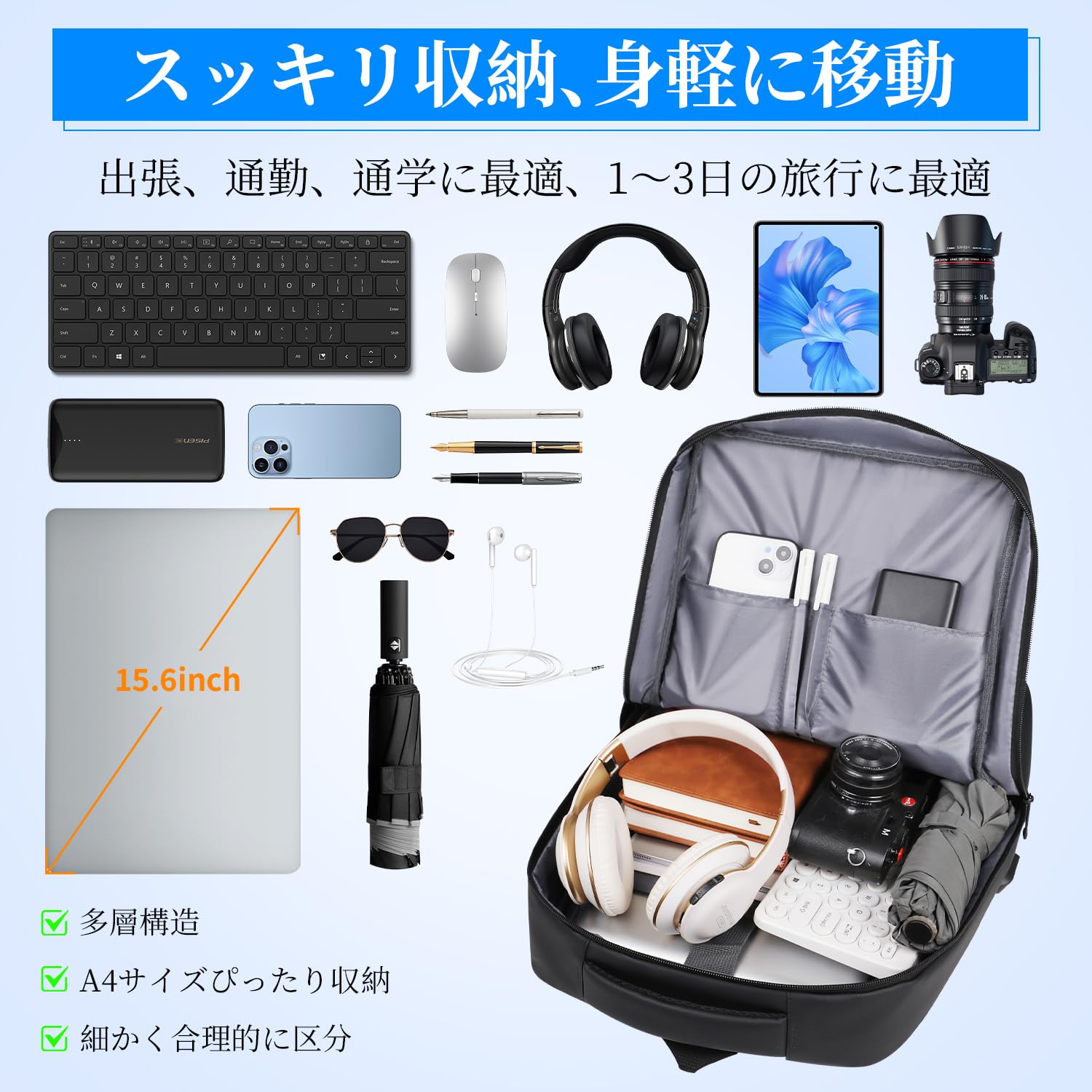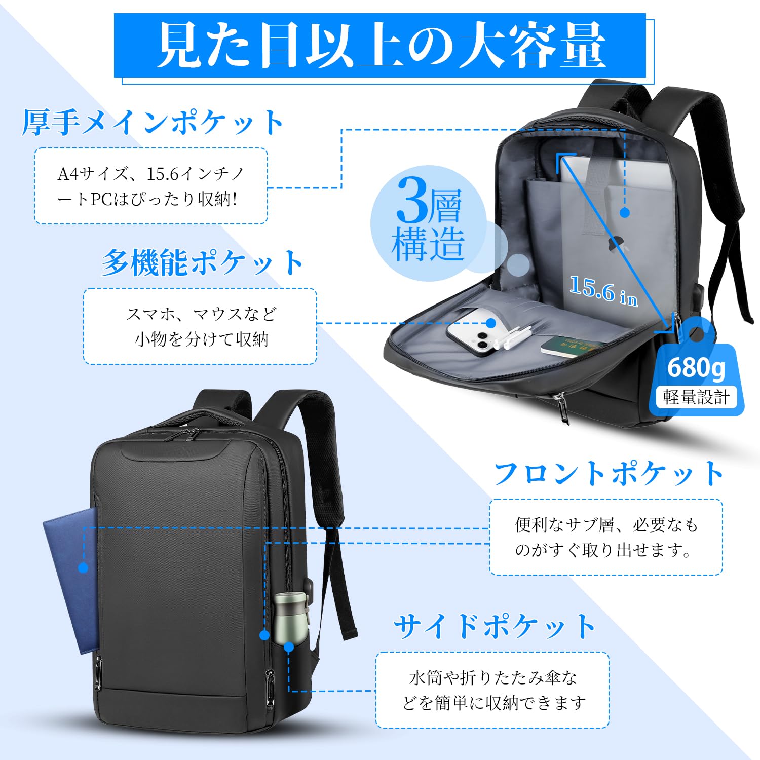 【大容量でスッキリ収納】23Lメンズリュックの大容量ながらも軽量設計、重さたったの680gで持ち運びラクラク。A4サイズはすっぽり収まり、15.6インチPC、タブレット、デジタルカメラ、ジャケットなどの大きな荷物も安心して収納可能!3層構造のデザインで、メインポケット、PCポケット、多機能ポケット、サイドポケットを完備し、多彩な収納ニーズに応えます!