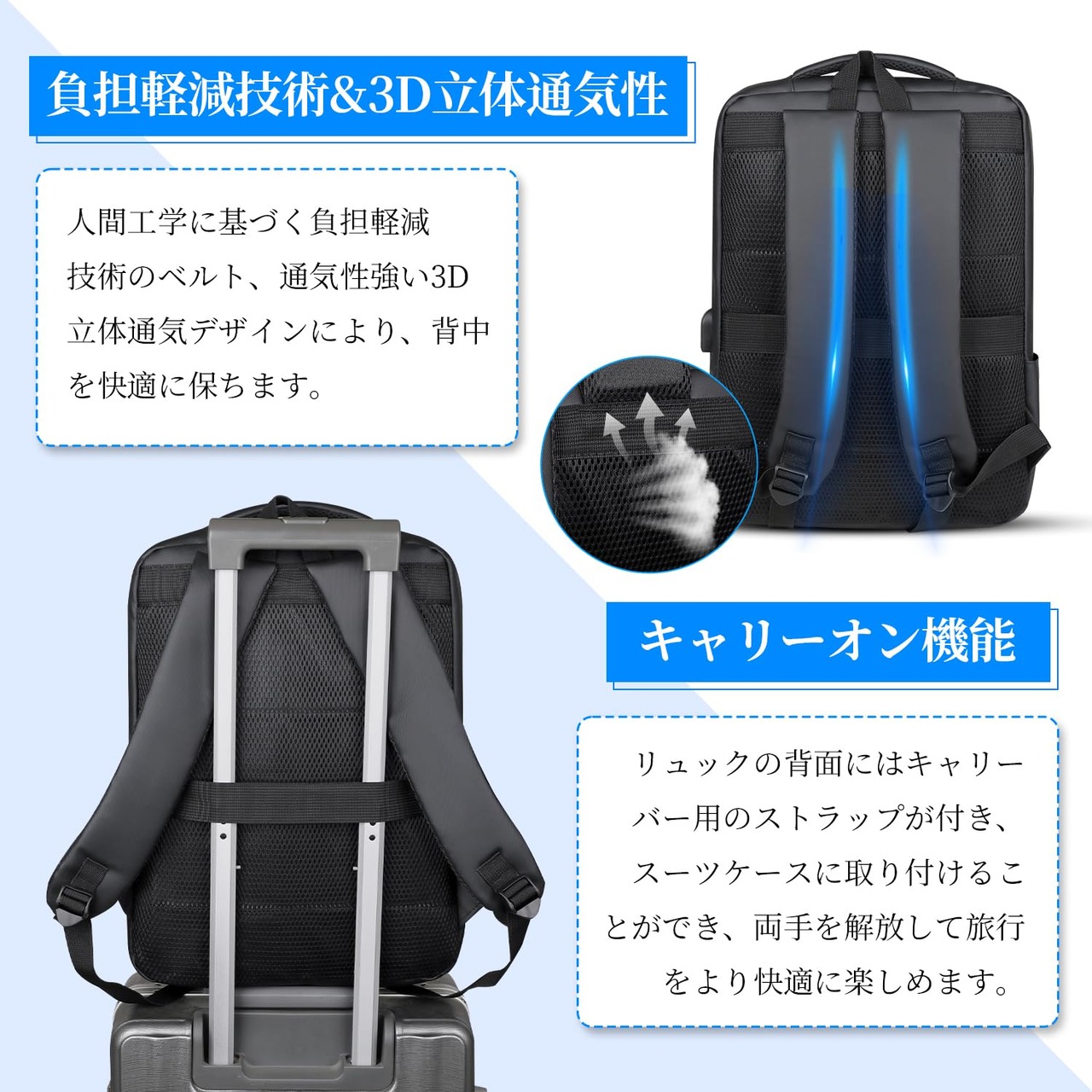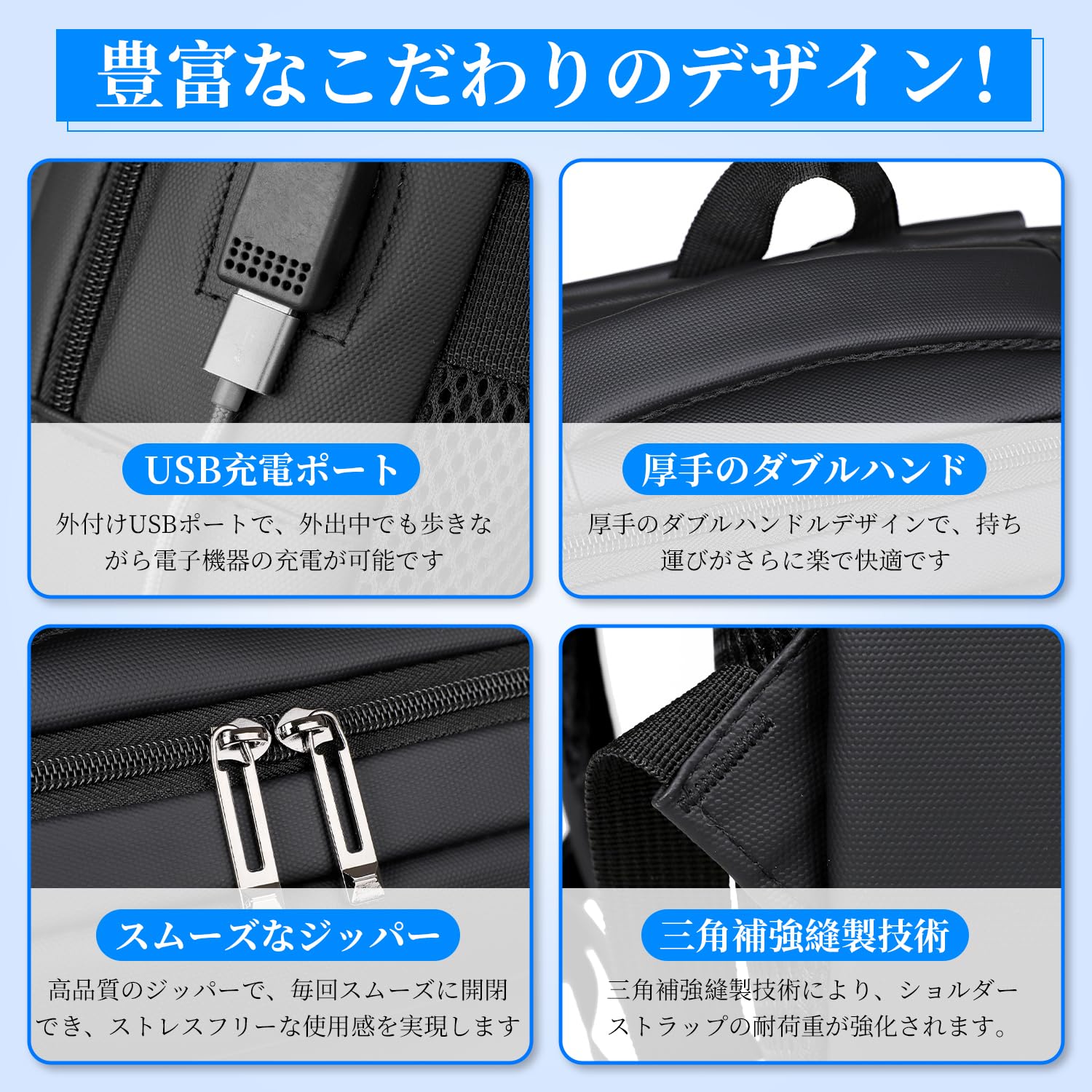 【こだわりのディテール!】①外付けUSBポートで、外出中でも歩きながら電子機器の充電が可能。②カバンの背面にはキャリーバー用のストラップが付いており、バックパックをスーツケースに取り付けることができ、両手を解放して旅行をより快適に楽しめます。③厚手のダブルハンドルデザインで、持ち運びがさらに楽で快適です。 ④高品質のジッパーで、毎回スムーズに開閉でき、ストレスフリーな使用感を実現します。