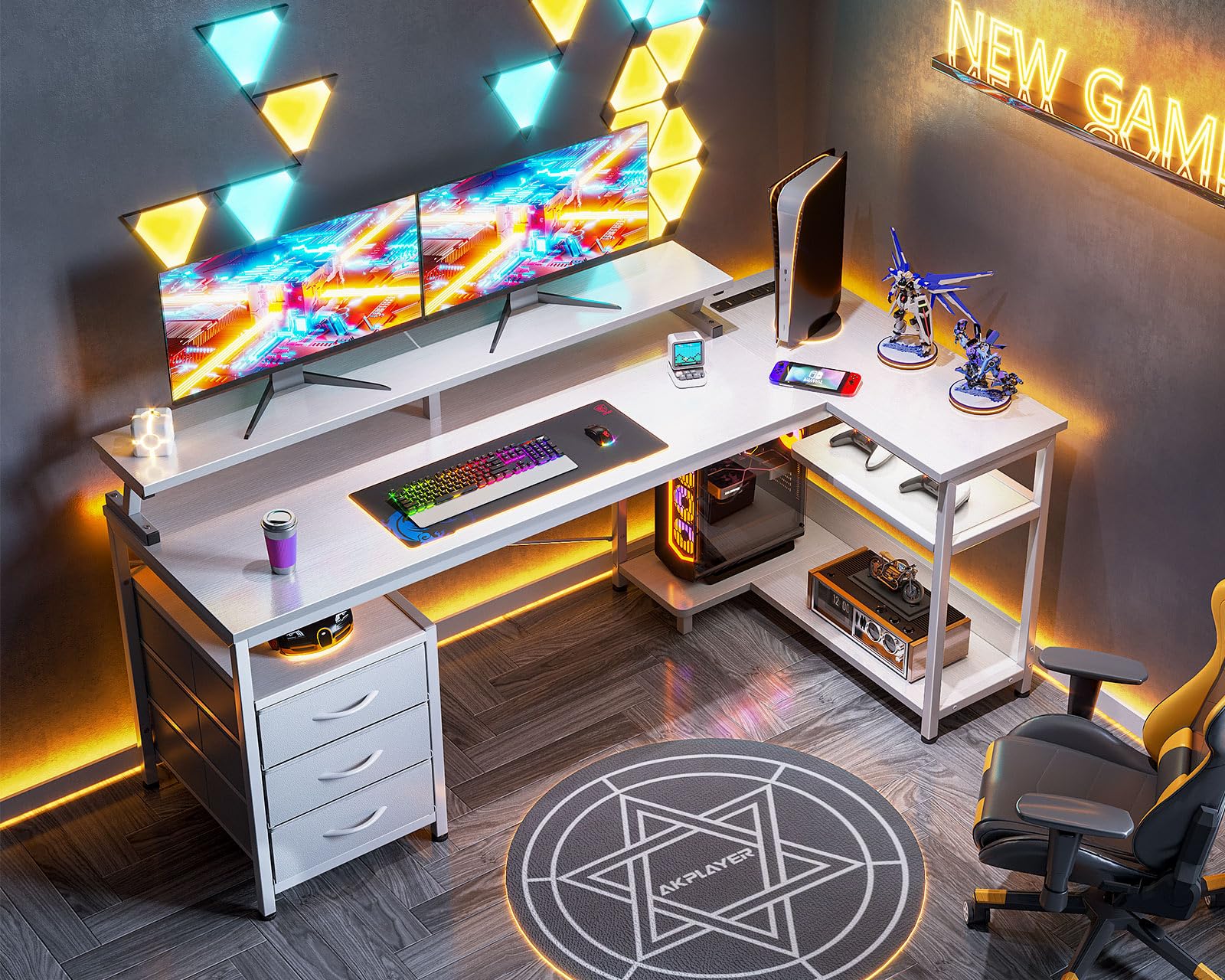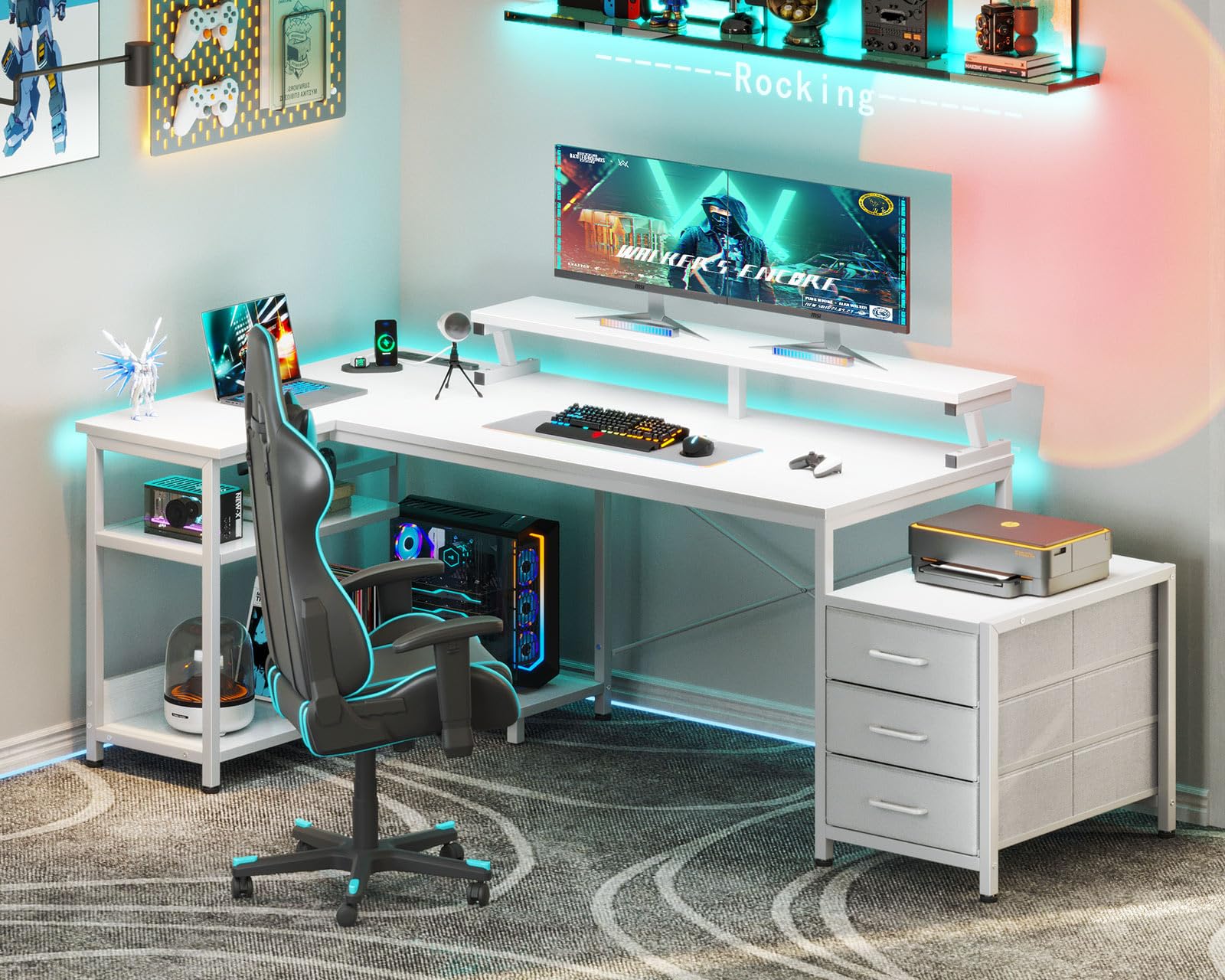 ODK パソコンデスク 引き出し3杯付き ゲーミングデスク コンセント付き l字デスク デスク 机 幅184/146*80 pcデスク 棚付き 収納 オフィスデスク 在宅勤務 仕事用 組立簡単 ホワイト