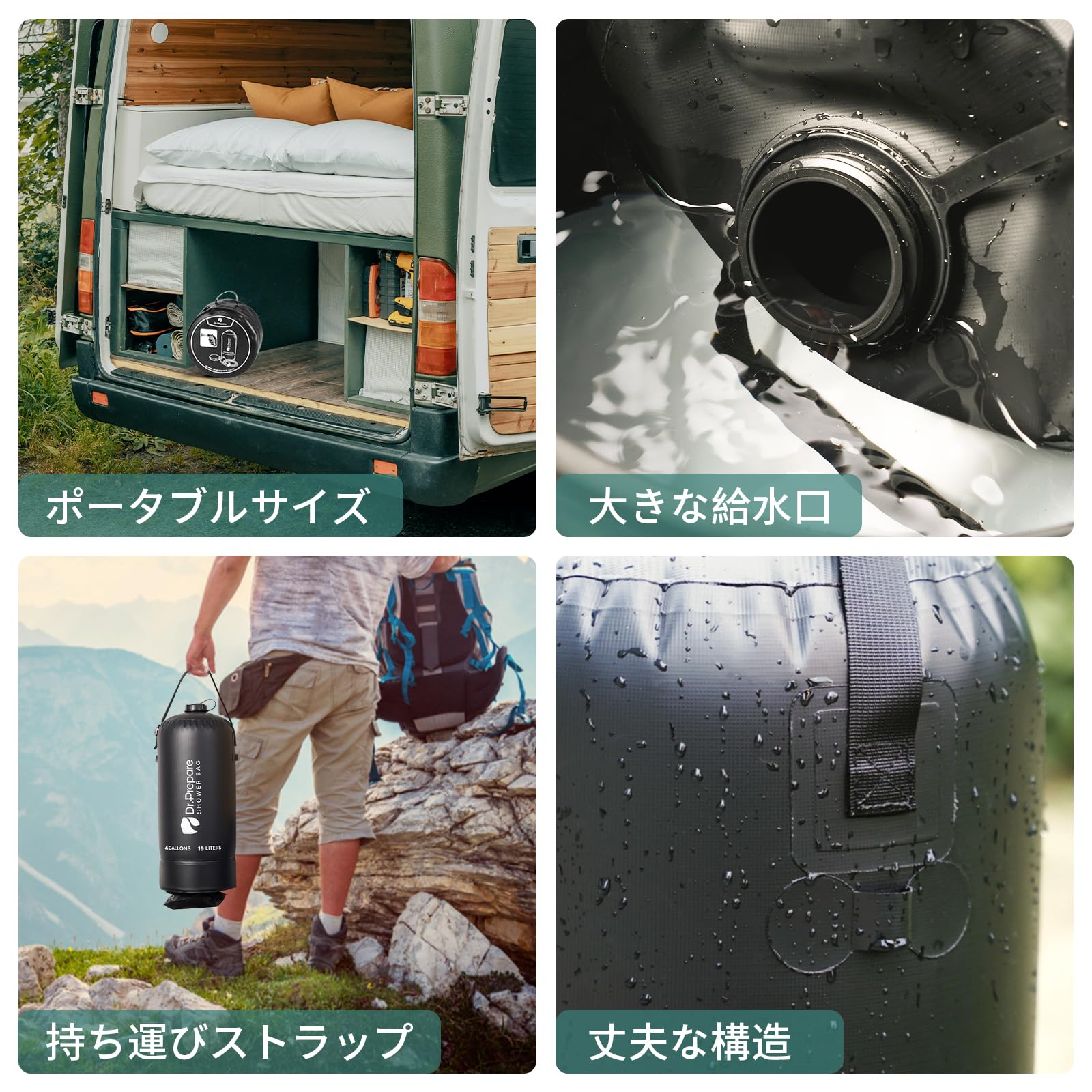 DR.PREPAREポータブルシャワー 簡易シャワー アウトドア シャワー 手動 加圧式 キャンプ 海 ポンプ ソーラー加熱 防災 15Lタンク ブラック