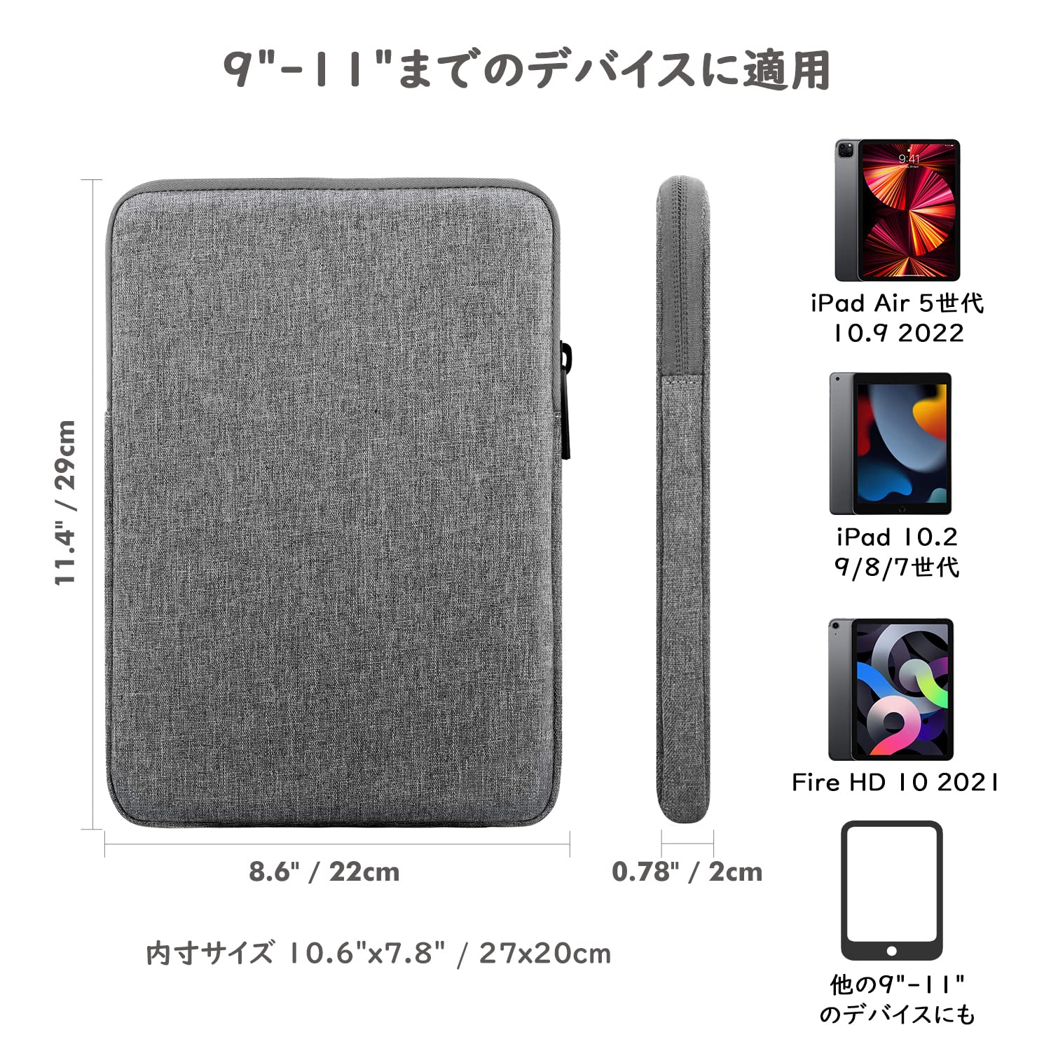 「対応機種」 外部寸法:29 x 22 x 2 cm。9~11インチまでのノート・タブレットPCに適用します。iPad 第11世代 2025、iPad Air/Pro 11インチ(M3/M2)、iPad 第10世代 2022、iPad mini 第7/6世代、iPad Air 10.9インチ 第5/4世代、iPad 第9世代 10.2 2021、iPad 第8世代 10.2 2020、iPad 第7世代 10.2インチ 2019、iPad Air(第3世代) 10.5インチ2019、iPad Pro 11インチ(2018/2020/2021)、iPad Pro 10.5インチ 2017、iPad 9.7 第6/第5世代(2018 / 2017)、iPad 1/2/3/4、iPad Air / Air 2、fire HD 10 / 10 Plus、Surface Go 等に適用します。ご購入の際に、機種とサイズを予めご確認ください。
