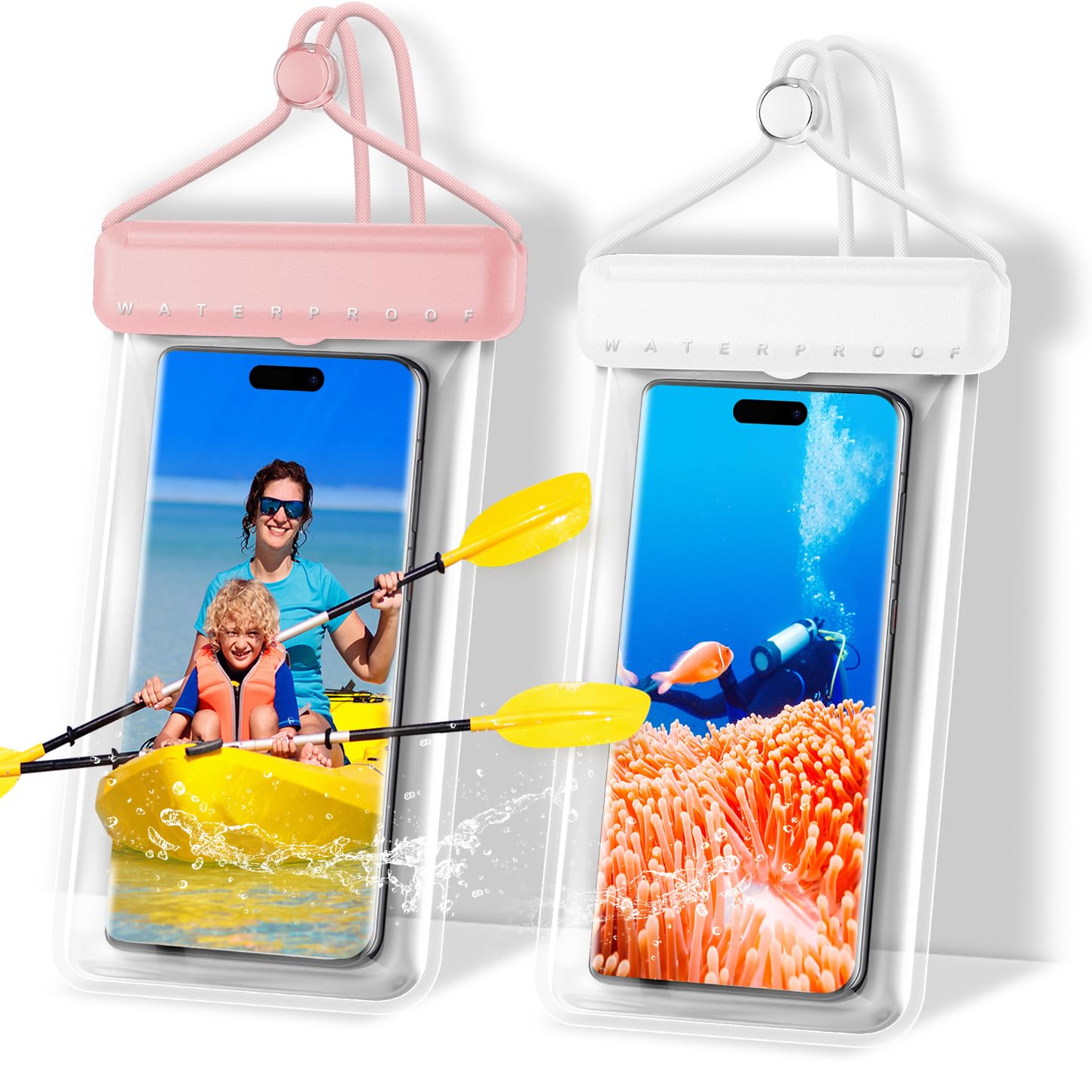 スマホ 防水ケース 【新登場 & 2枚セット】 IPX8完全防水 指紋認証/Face ID認証対応 高透過率 水中撮影 防水 ケース お風呂 山登り 海水浴 釣り 水泳など適用 タッチ快適 iPhone/Android 7.2インチ以下全機種対応 (ホワイト+ピンク)