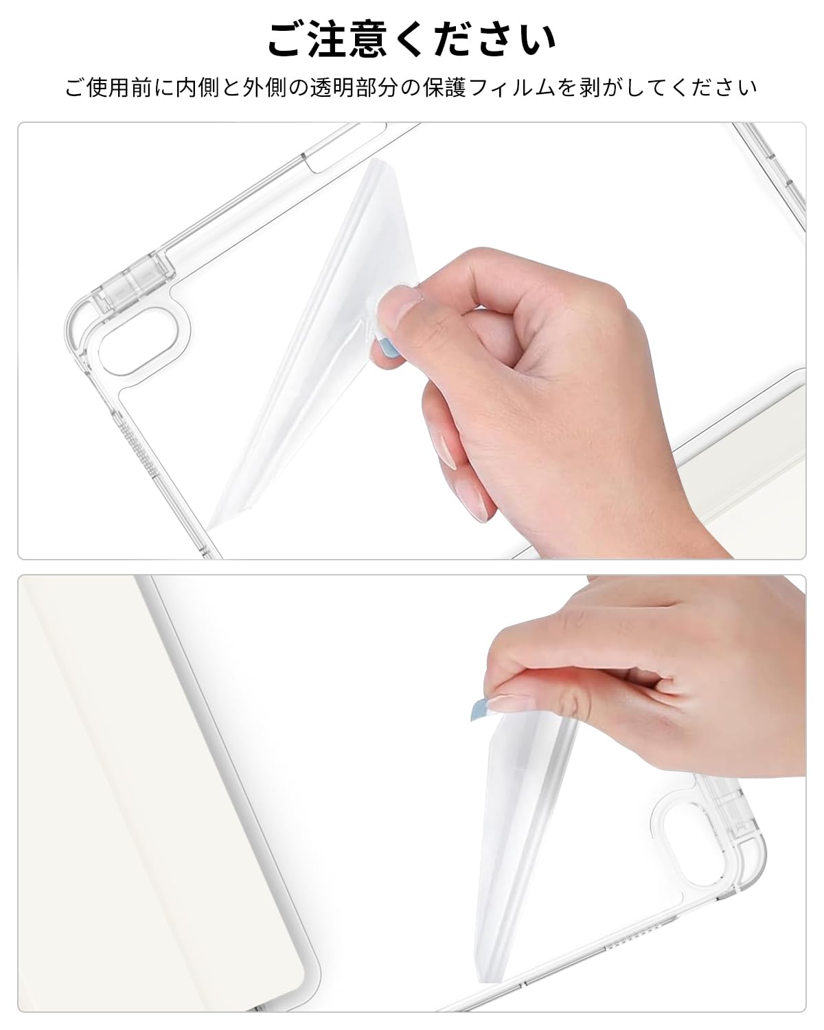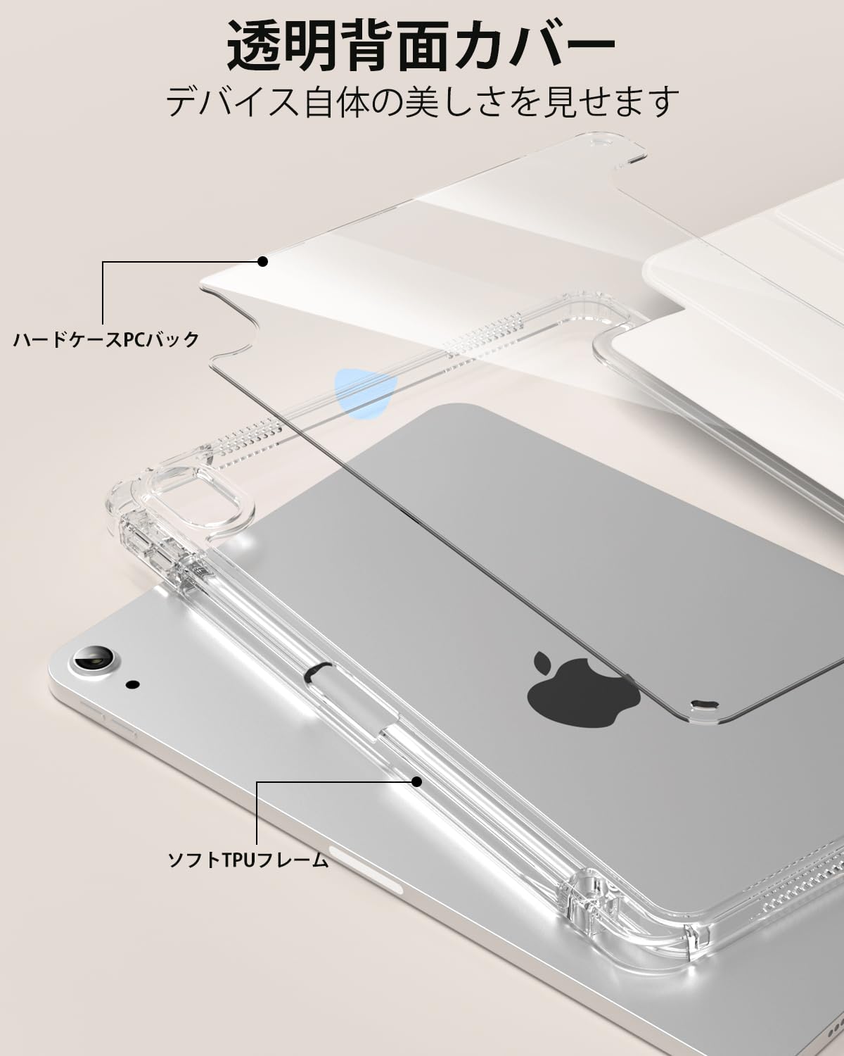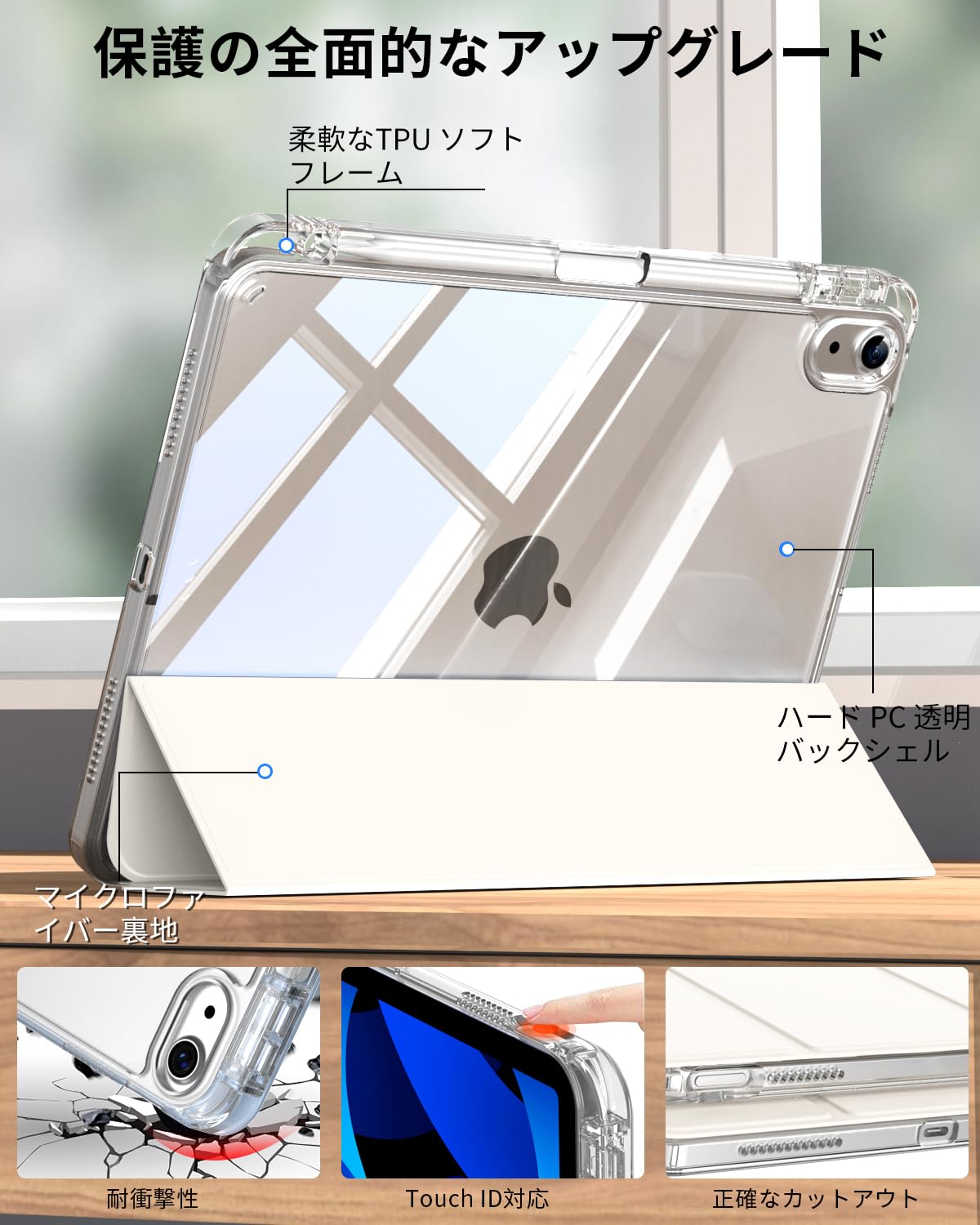 【透明な背面カバー】表面はPUレザー素材で作られ、裏面は透明なアクリル素材で作られ、デバイス自体の美しさを見せます。フレームには衝撃に強い柔軟なTPUを採用し、軽量かつ極薄で、四隅にクッション性のあるソフトフ、落下によるダメージを防ぎます。 (注意: 透明バックカバーの内側と外側に傷防止保護フィルムの層があります。使用前に保護フィルムを剥がしてください)