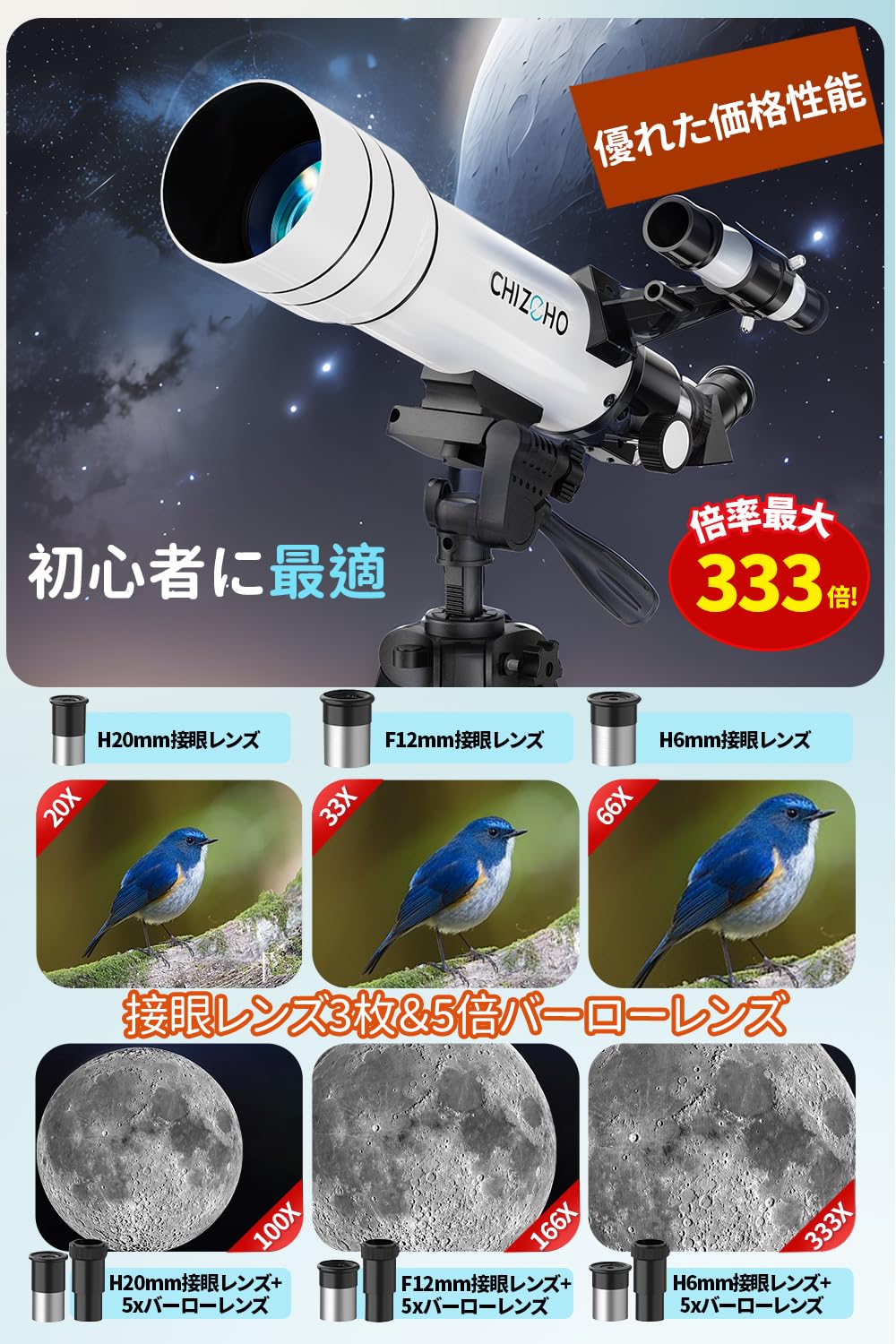 [直径70mmマルチコート光学対物レンズ、明るくクリアな視界を完璧に提供します] CHIZEHO天体望遠鏡は70mm大口径光学対物レンズを組み込み、光吸収面積を拡大し、複合コーティングにより光透過率を高め、画像をより明るく鮮明にします。(同じ明るさであれば、CT12天体望遠鏡は他の製品に比べ、20%明るくクリアな視界が得られます)