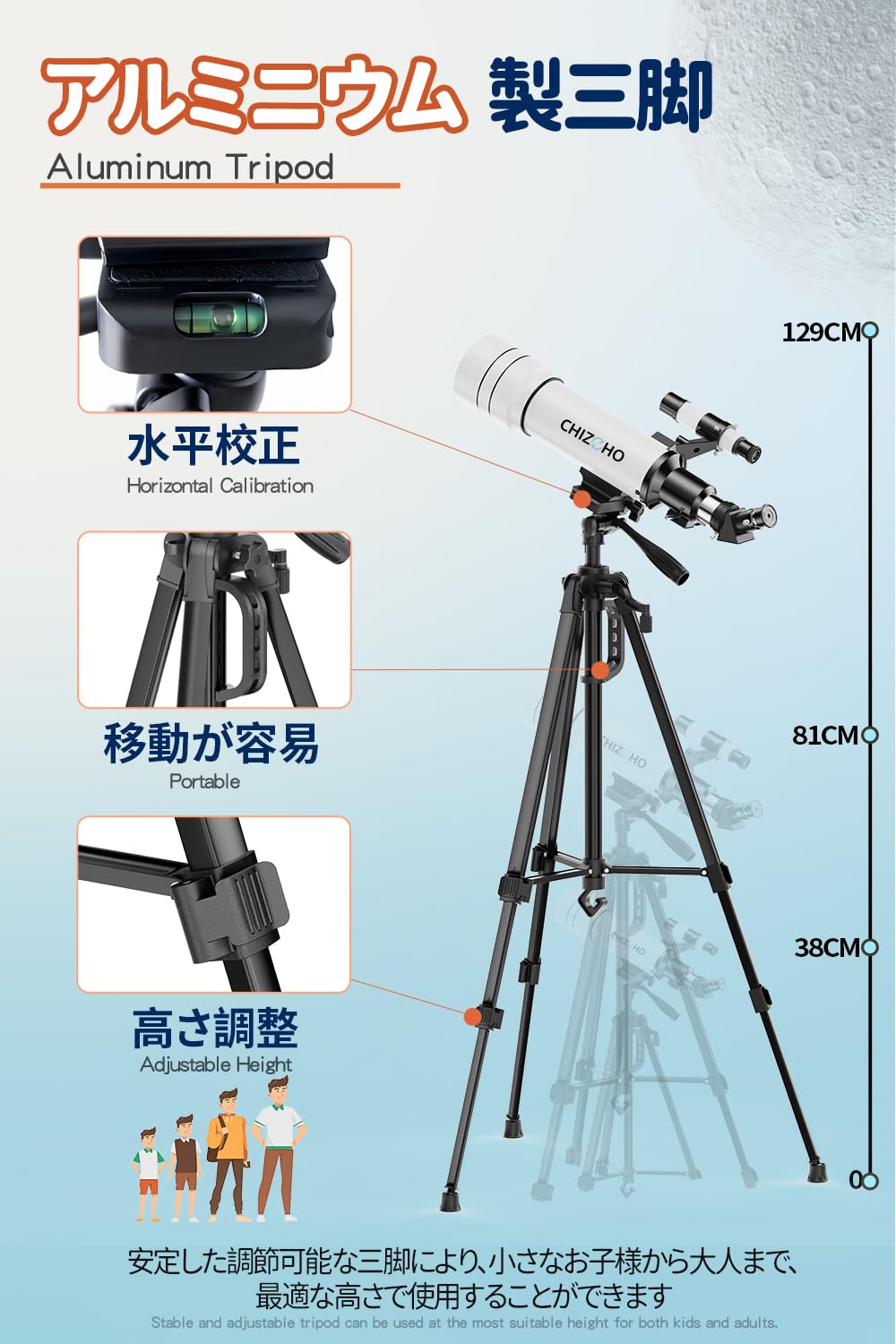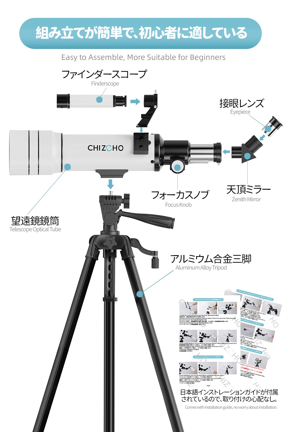 [日本語の取扱説明書と専門のオンラインテクニカルサポートで、設置から使用まで安心です] CHIZEHO天体望遠鏡は、子供や初心者向けの製品として、詳細な日本語の組み立てマニュアルが付属しており、使い方の難しさを最小限に抑えることができます。さらに、1年間の製品と24時間365日のオンラインアフターサービスがあり、安心してご利用いただけます。商品に問題がある場合は、いつでも販売者にご連絡ください。