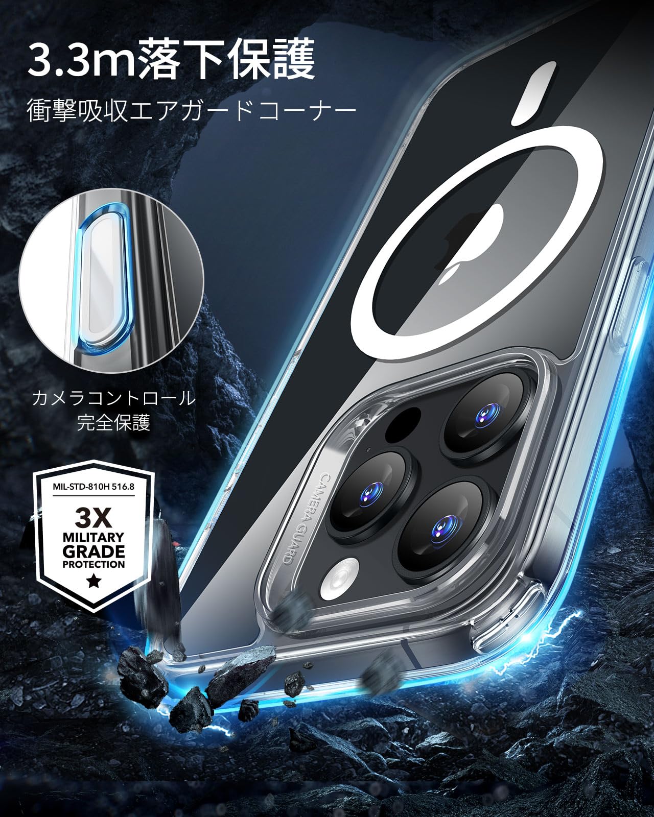 【軍事レベル基準!衝撃から守る全方位ガード】 米軍規格MIL-STD-810Hの落下試験に合格したエアガードコーナー(認証番号:GZMR231203686802)を採用します。iphone16promax ケース はコンクリートへの高さ3.3メートル落下テストにも耐える設計で、駅のホームでの使用や登山中など、アクティブなシーンでも安心できます。うっかり落とした時も、大切なiPhoneを確実にプロテクトします