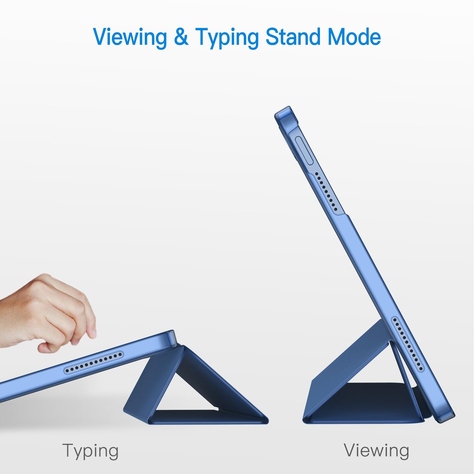マグネット内蔵、オートスリープとオートウェイクアップ機能が付きます。三つ折りフロントカバーにより、視聴とタイピングに合わせた2つスタンド角度を調整できます