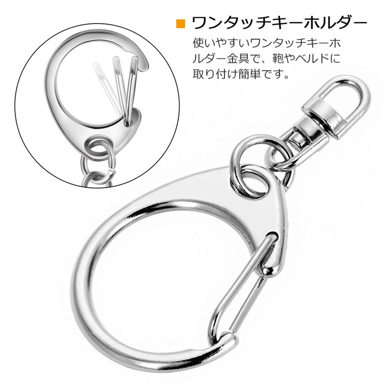 『使いやすい』ワンタッチ式なので簡単にバッグやベルトに取り付けます、回転カン付きのため、裏表を気にせず付けることができ、ねじれずにとても使いやすいです。大変便利な鍵用金具セットです。