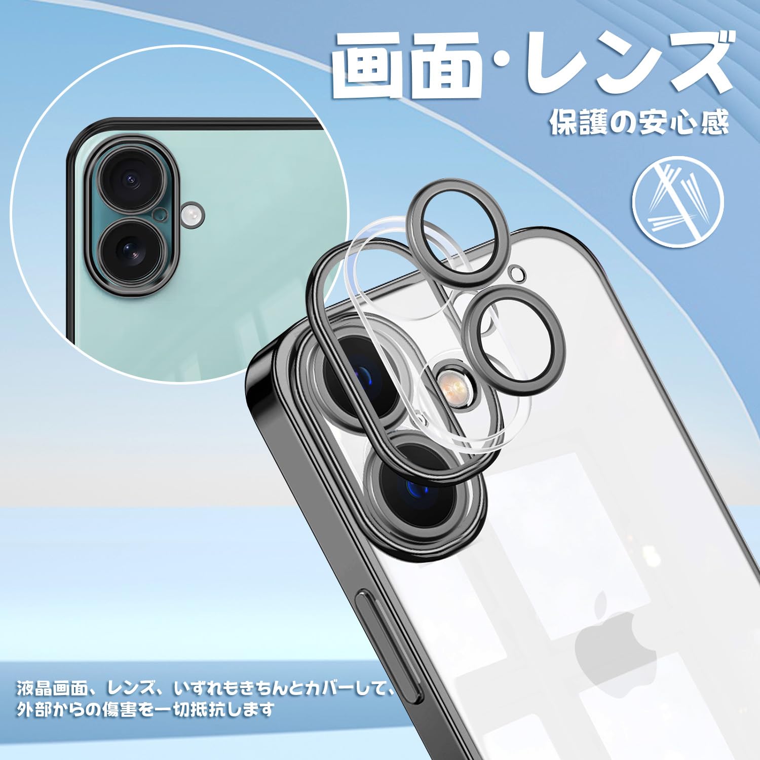 iPhone 16 用 ケース クリア 【カメラレンズ保護付き/フィルム付き】 アイフォン16 用 カバー スマホケース 透明 TPU 薄型 耐衝撃 スリム 黒 メッキ加工 黄変防止 ストラップホール付き ワイヤレス充電対応 iphone16 用 クリアケース ブラック