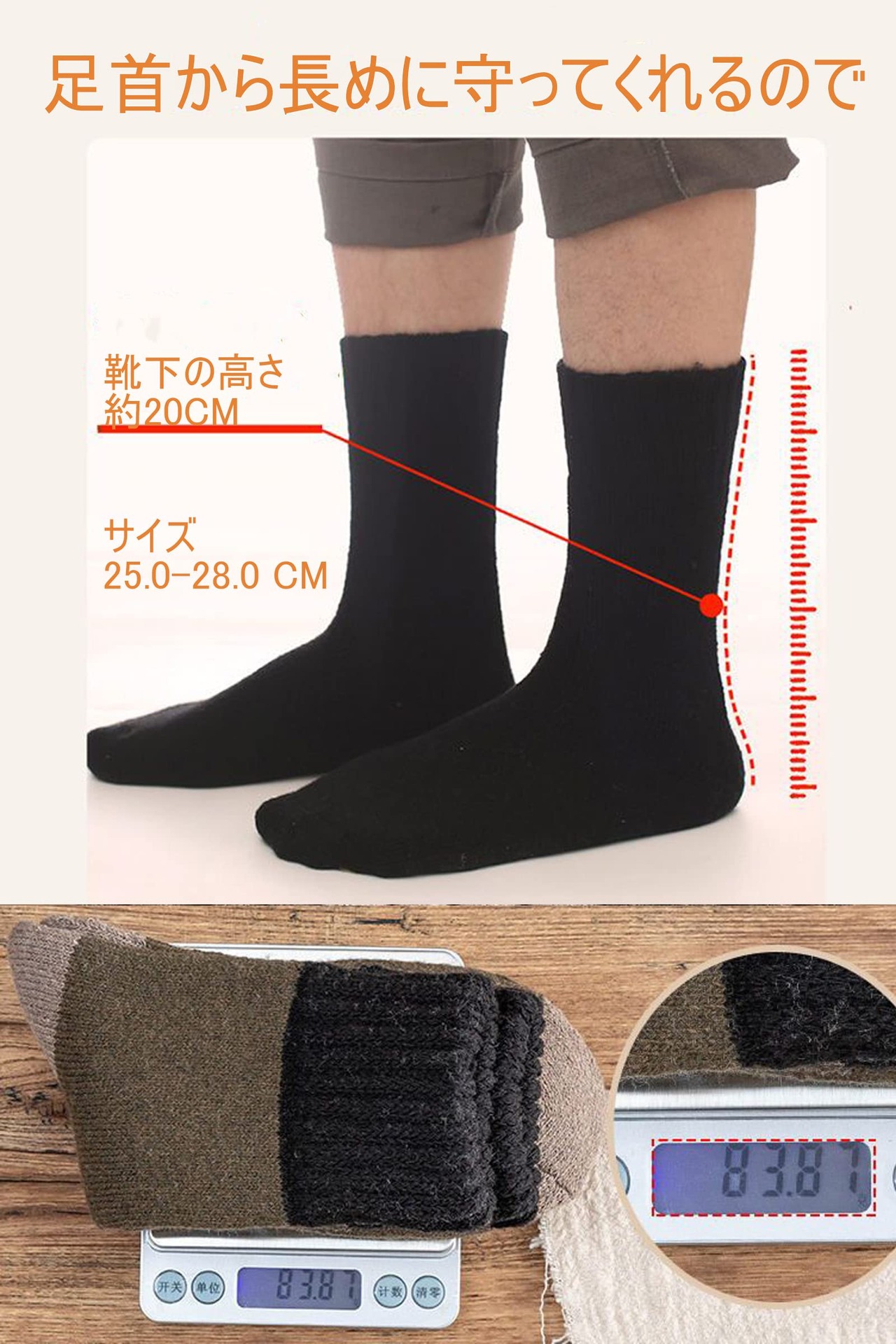 ウールがいい感じで暖かさを導いてくれる。ウール30%、綿10%、ポリウレタン15%、ポリエステル45%の複合素材なので伸縮性が高く保温性も抜群です、それなりに暖かさは感じられます。それでいて蒸れもありません。くるぶしの上5センチくらいのイメージです。毛糸はクオリティの高いウールが使われているので非常に暖かくクッション性の効いたフカフカした歩き心地。足の部分は生地の密度が高いようなので、高級感があります。ウール含有率と値段のバランスはこれが最強だと。