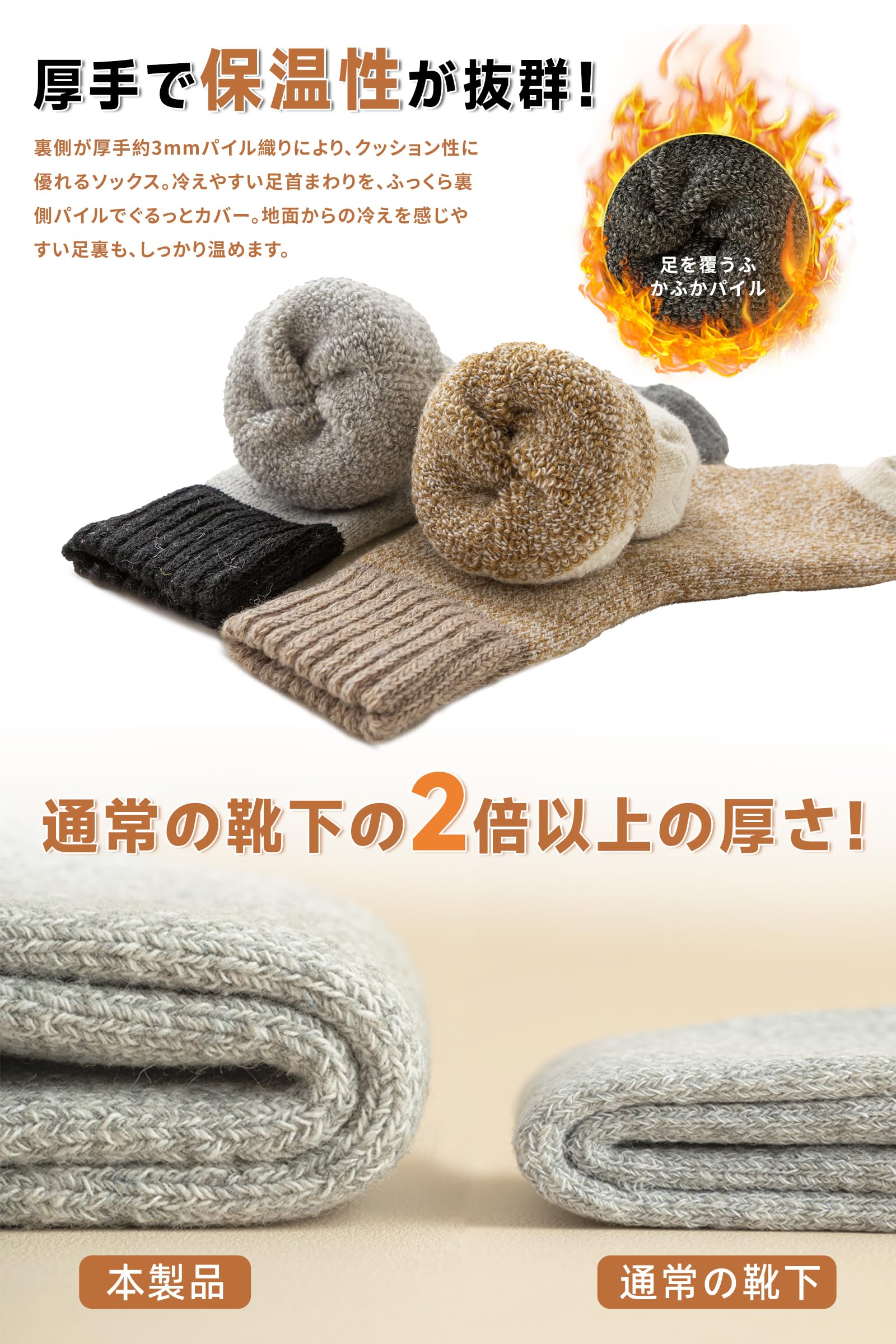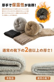 寒さが苦手な方はこちらの厚手の靴下がおススメです。最近、「足が寒い」と悩んでいる方、この靴下を履けば、もう、そんなことはありません。暖房を入れるほどでも無い室温でも、足元は意外と冷たくなるものです。そんなときに役に立ちます。冷たかった足先が、だんだんと気にならない程度にはなります。足首まですっぽりと覆ってくれる長さなので、椅子に座っても足首が暖かいです。通勤など外出から自宅での過ごし方でももちろん使えるので今年は暖房費が節約できそうです。