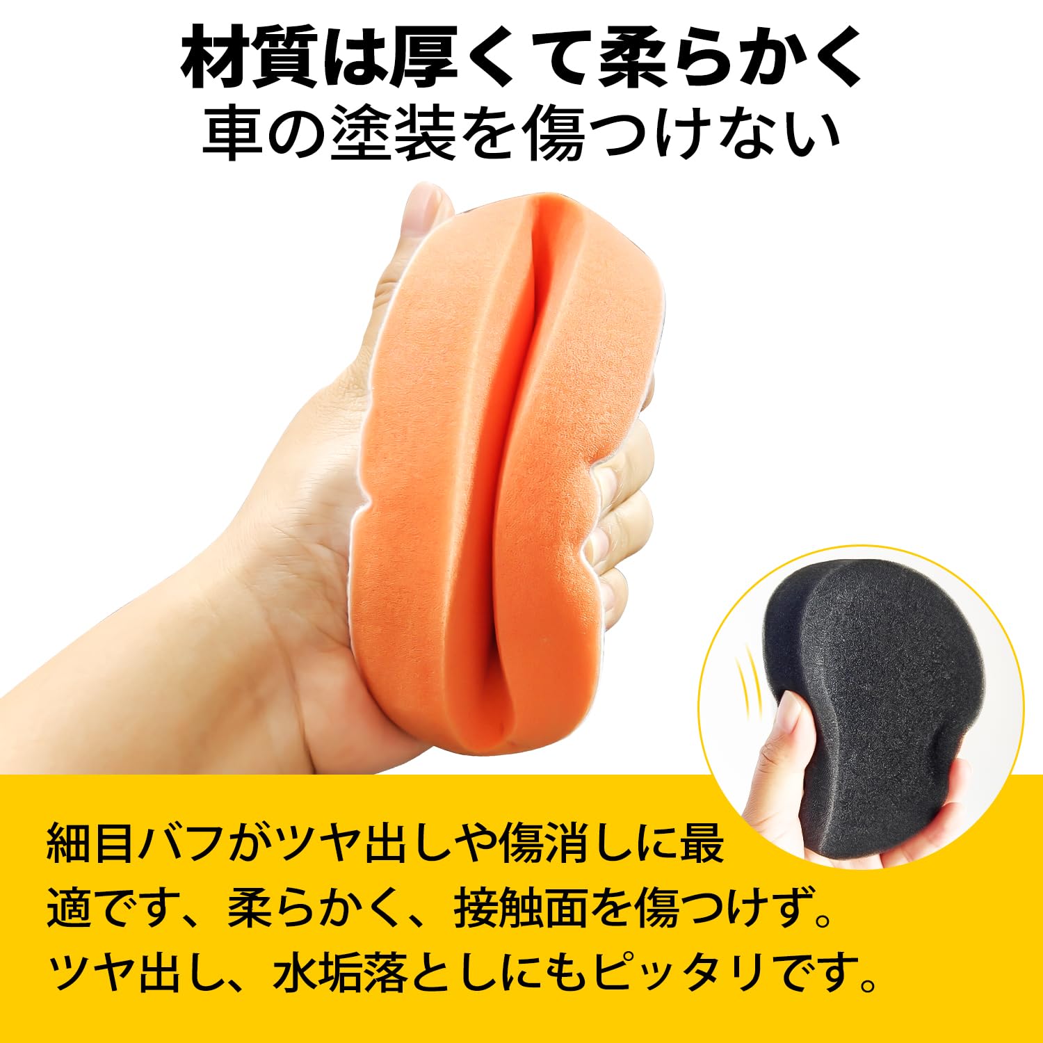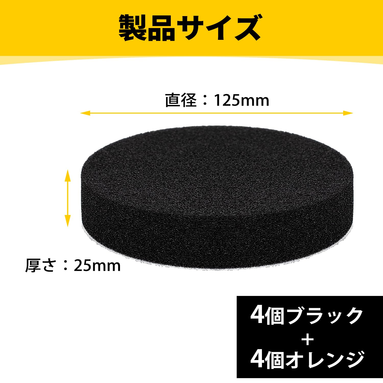 【商品仕様】セット内容:8個入り ポリッシャー バフ(4個オレンジ + 4個ブラック);サイズ:直径125mm、厚み25mm;材質:スポンジ;カラー:オレンジ+ブラック。