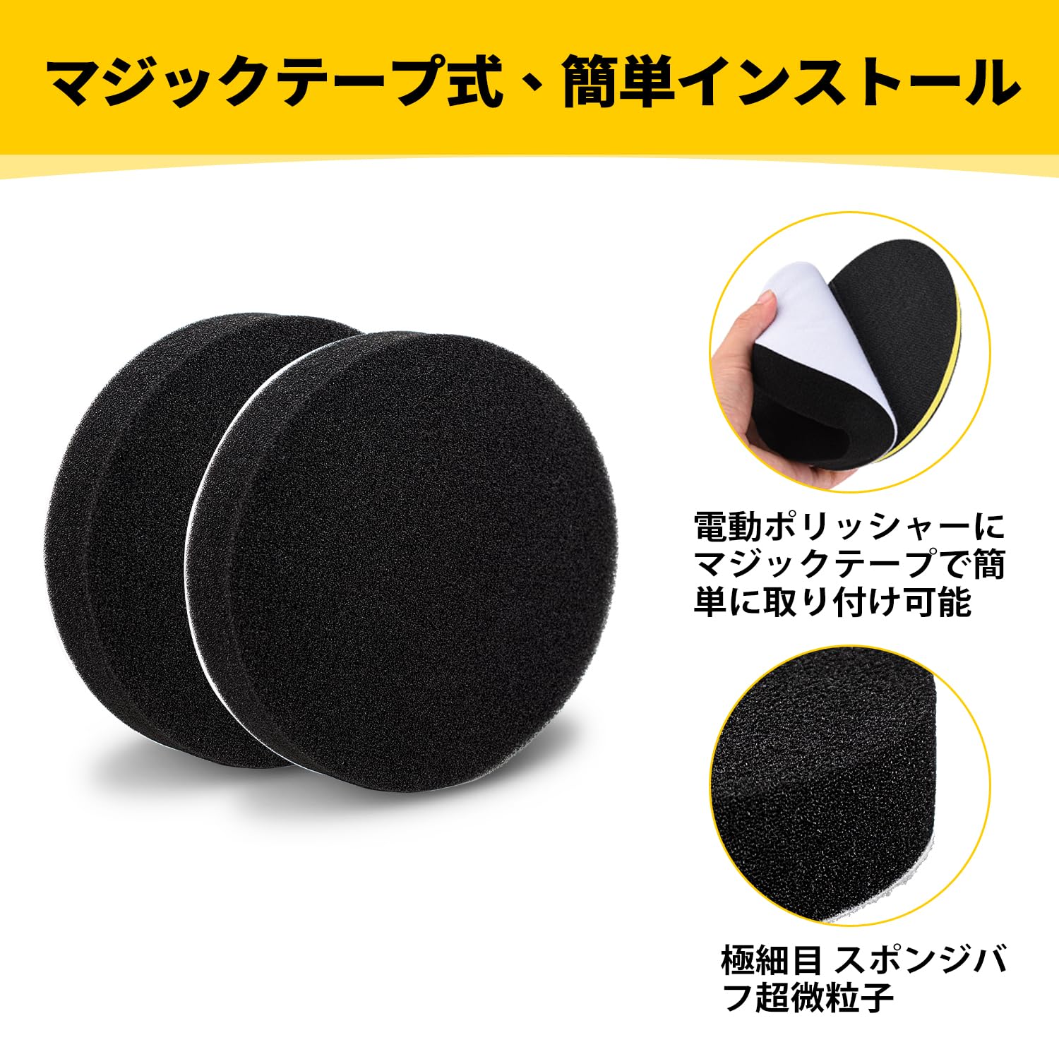 【取り付け簡単、多用途使用】取り付け簡単 ポリッシャー スポンジ 、マジックテープ式で脱着する便利なポリッシャースポンジで、電気研磨機、電気ドリル、エアーポリッシャーなどに取り付けることができます。多用途:洗車、ワックスがけ、コンパウンド作業、お風呂掃除などの研磨にご使用いただけます。