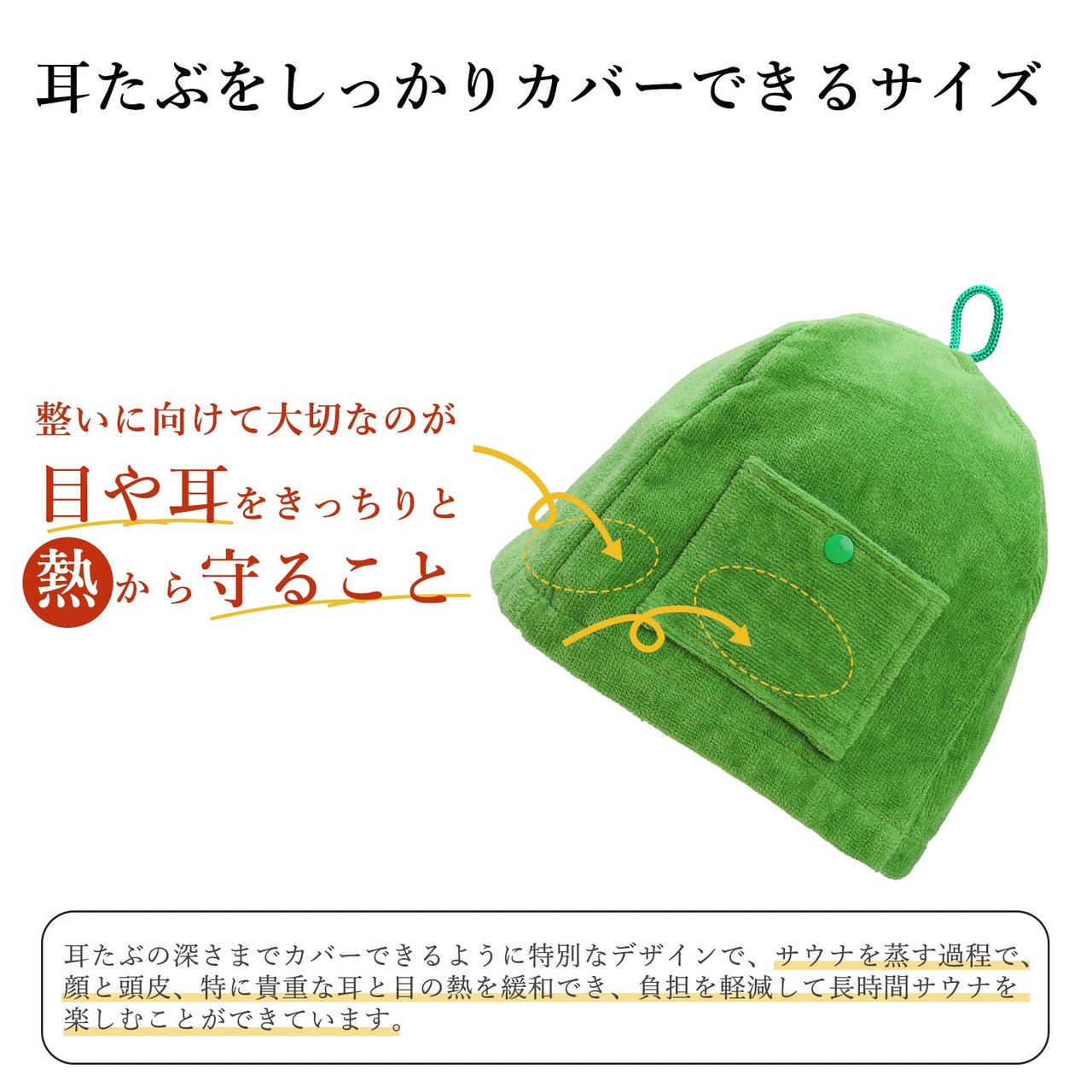 【頭や顔の熱が緩和可能】耳たぶの深さまでカバーできるように特別なデザインで、サウナを蒸す過程で、顔と頭、特に貴重な耳と目の熱を緩和でき、負担を軽減して長時間サウナを楽しむことができています。