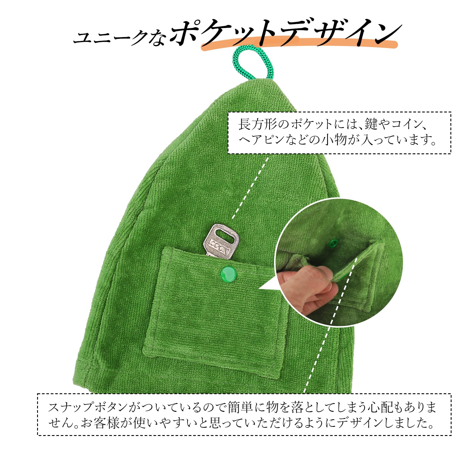【ユニークなポケットデザイン】ハットの上には長方形のポケットがあり、鍵やコインヘアピンなどの小物が入ることができます。スナップボタンが付いているので、小物を落としてしまう心配がありません。